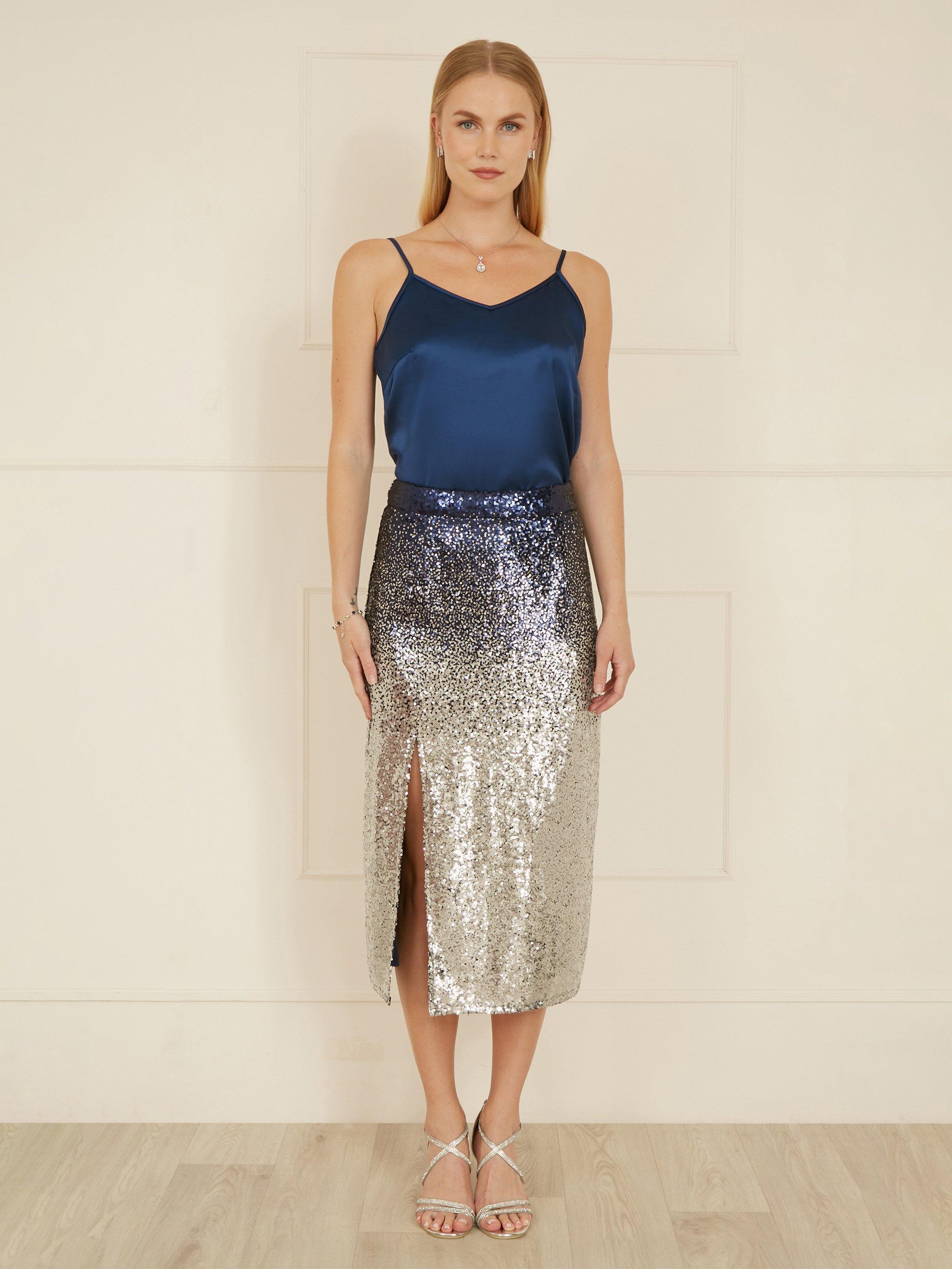 This gorgeous midi length skirt with high thigh split is a cool alternative for party season. In an all-over sequinned ombre design, the gradient looks beautiful and adds some sparkle to your invites. Add a simple top or some knitwear for effortless chic.
