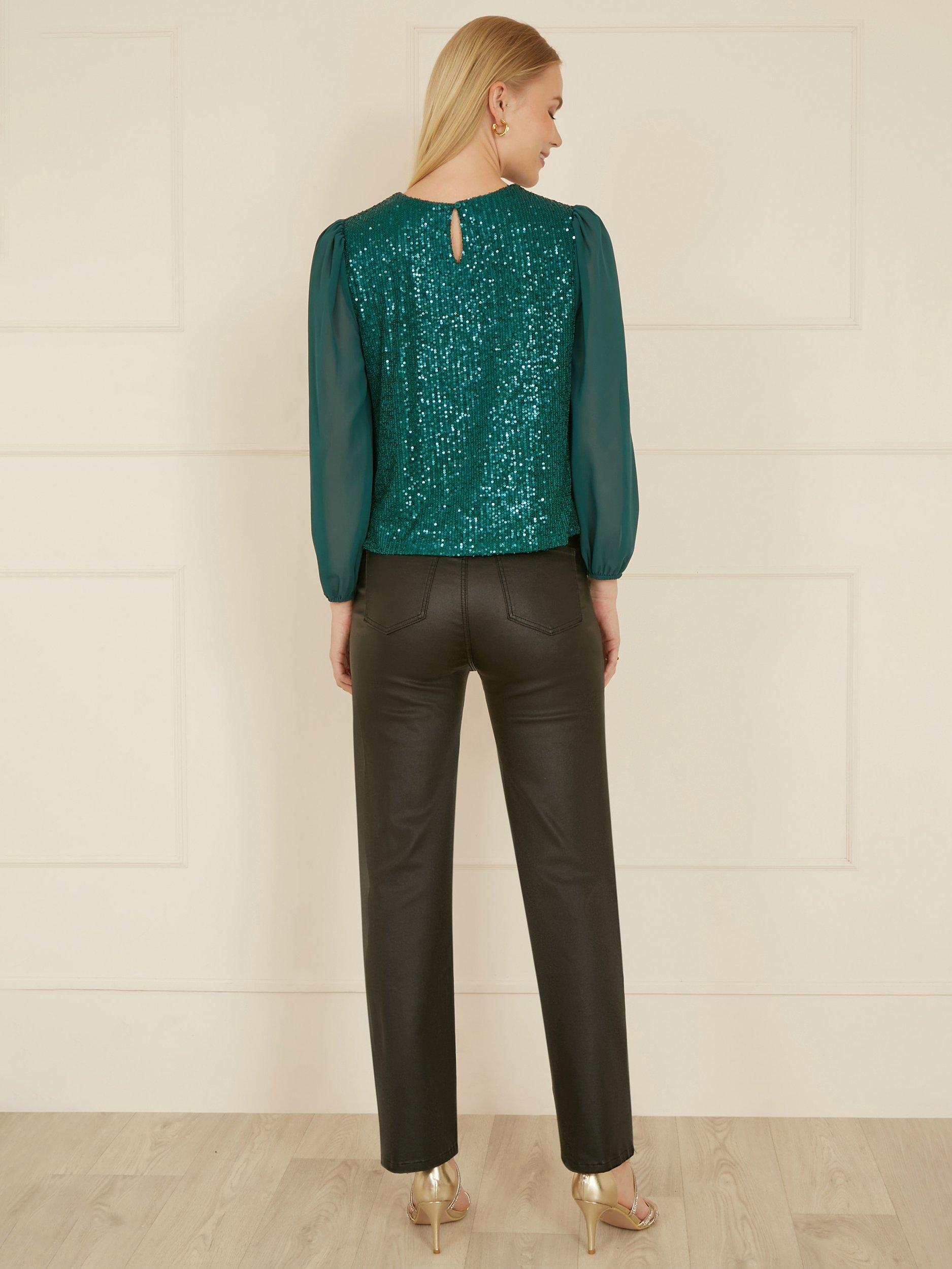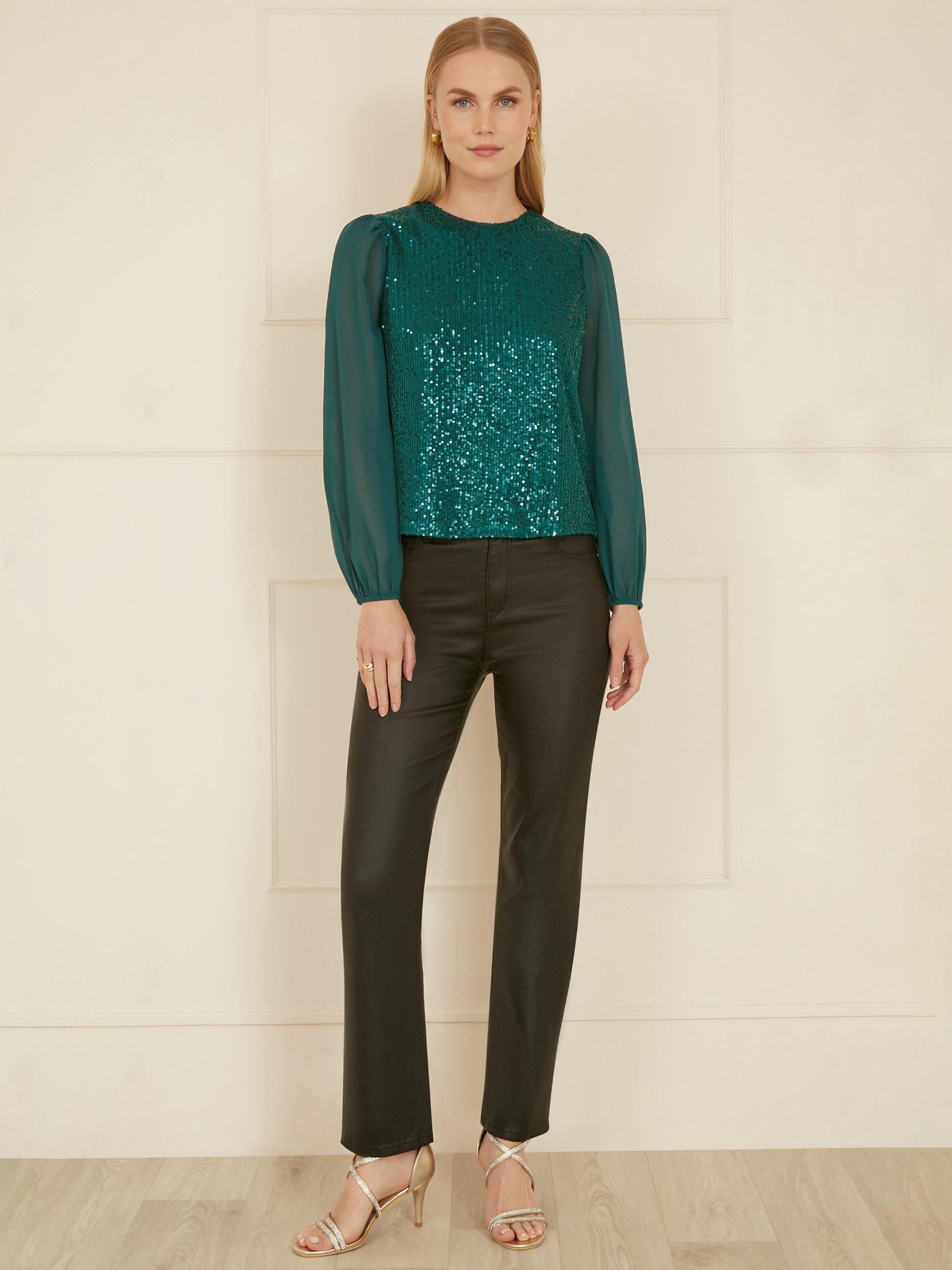 Shine bright like a diamond all party season with this cute navy top from Yumi. With a round neckline, fully sequined bodice front and back and gorgeous long sheer sleeves, this is the perfect partner to wide leg trousers, jeans or skirts.