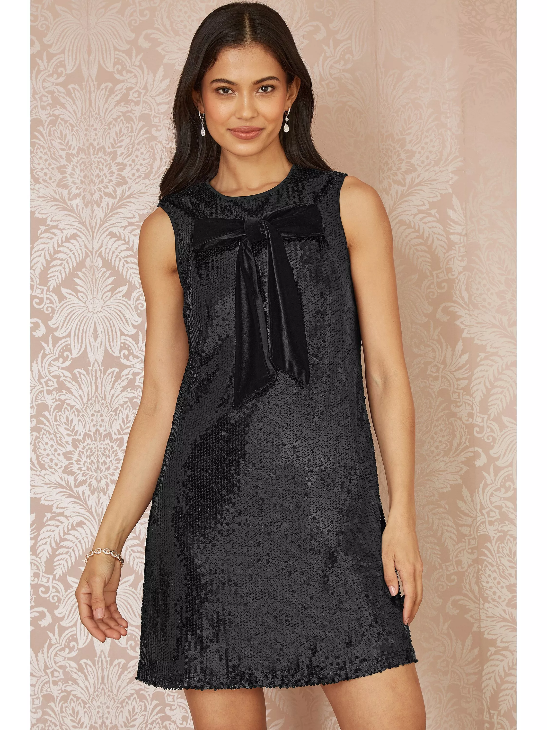 This mini tunic dress is as cute as can be for the party season! The shift shape is easy to wear, with a sleeveless fit and shorter hemline. The all over sequins and adorable bow detail on the front, truly make this fit unique.