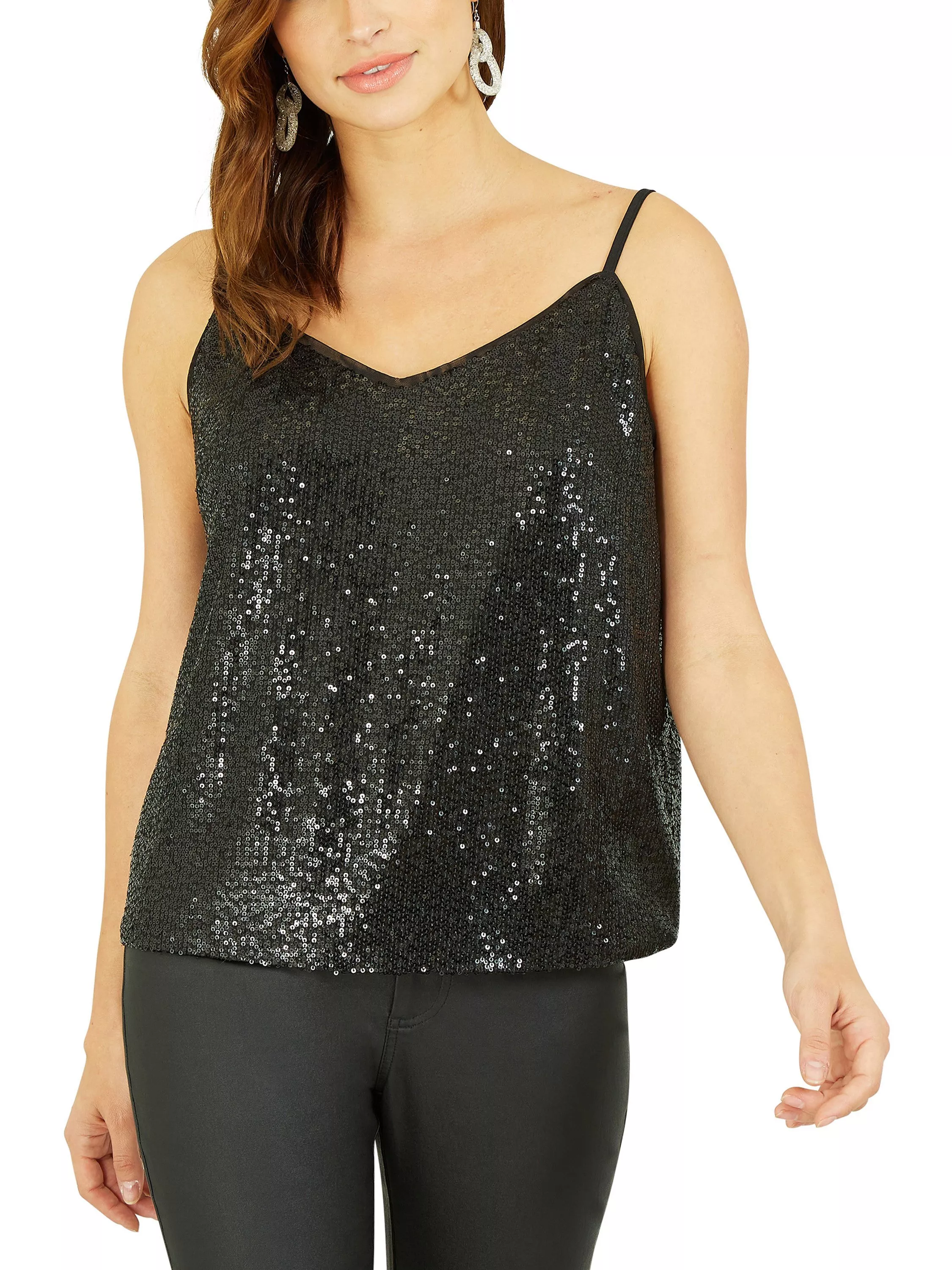 Sparkle this season in this Yumi Sequin Vest Top. A stunning, all-over seqinned, statement vest top. Features cross back skinny staps. Perfect partywear, matched with skinny jeans or leather trousers and an oversized blazer.