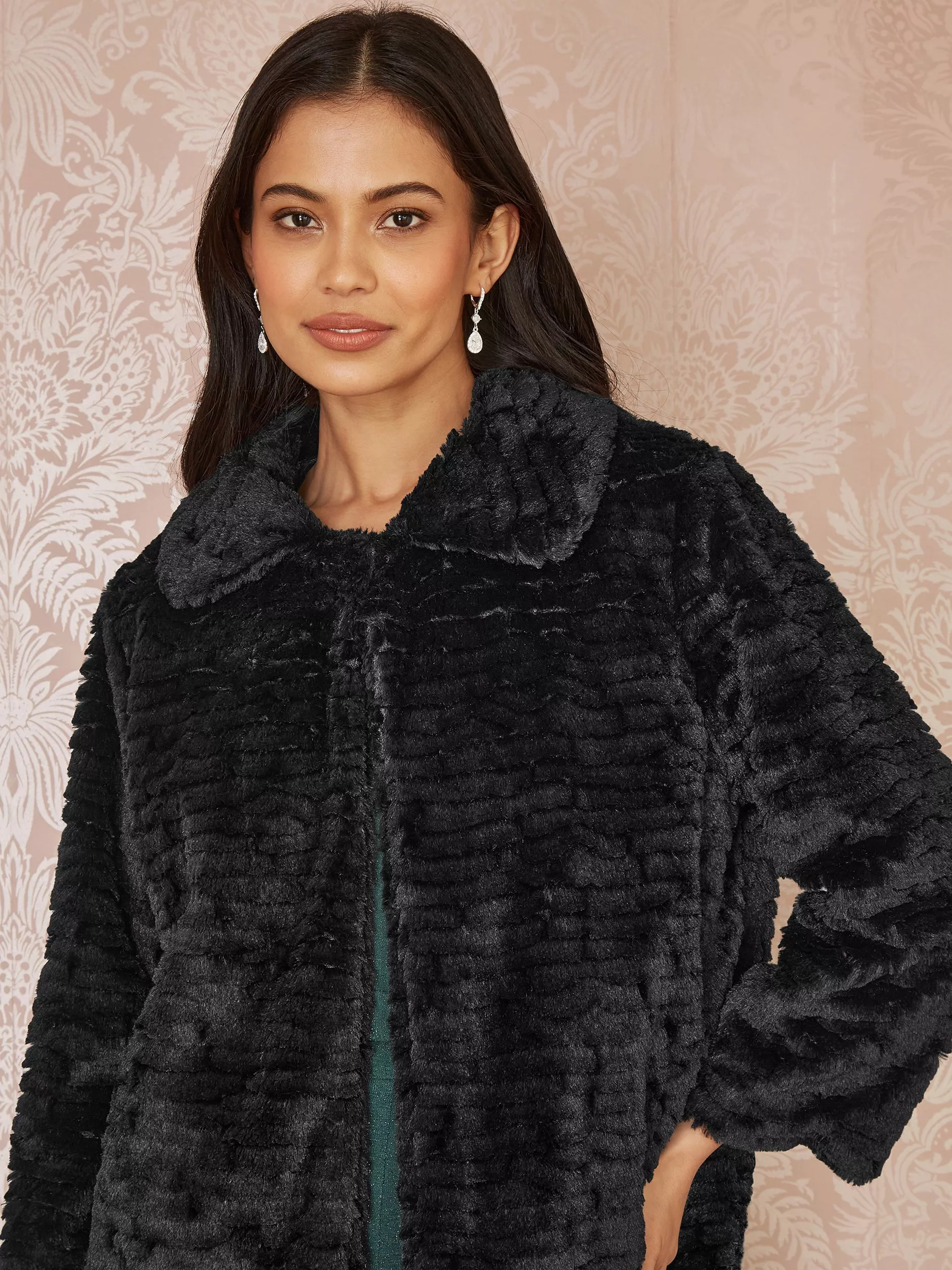 All about texture, this faux fur coat from Yumi sits at the hip for versatile coverage.