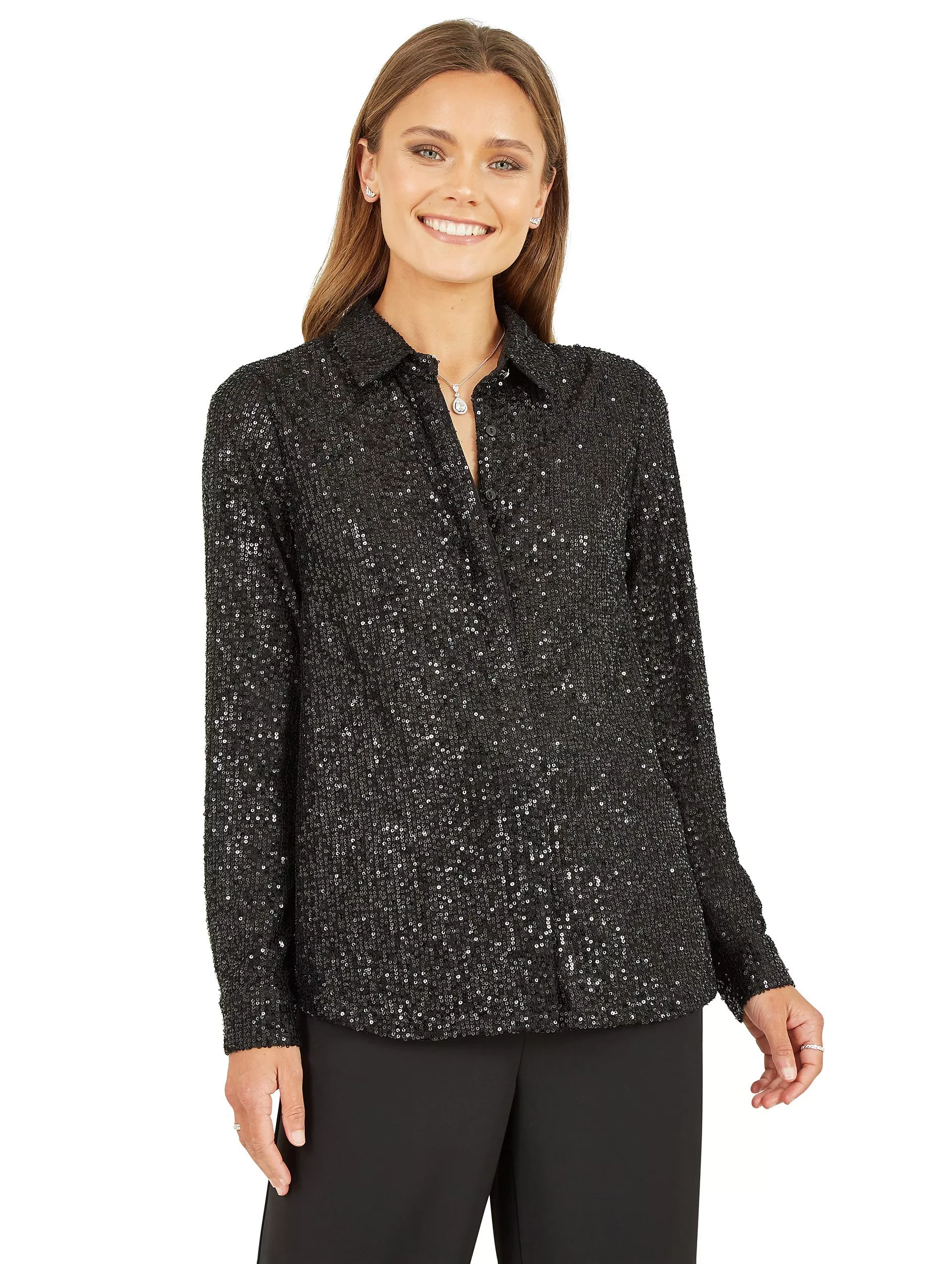 Designed with a crisp collar neckline and long sleeves, it is decorated with sequins for a dazzling finish and is the perfect top for your next party.