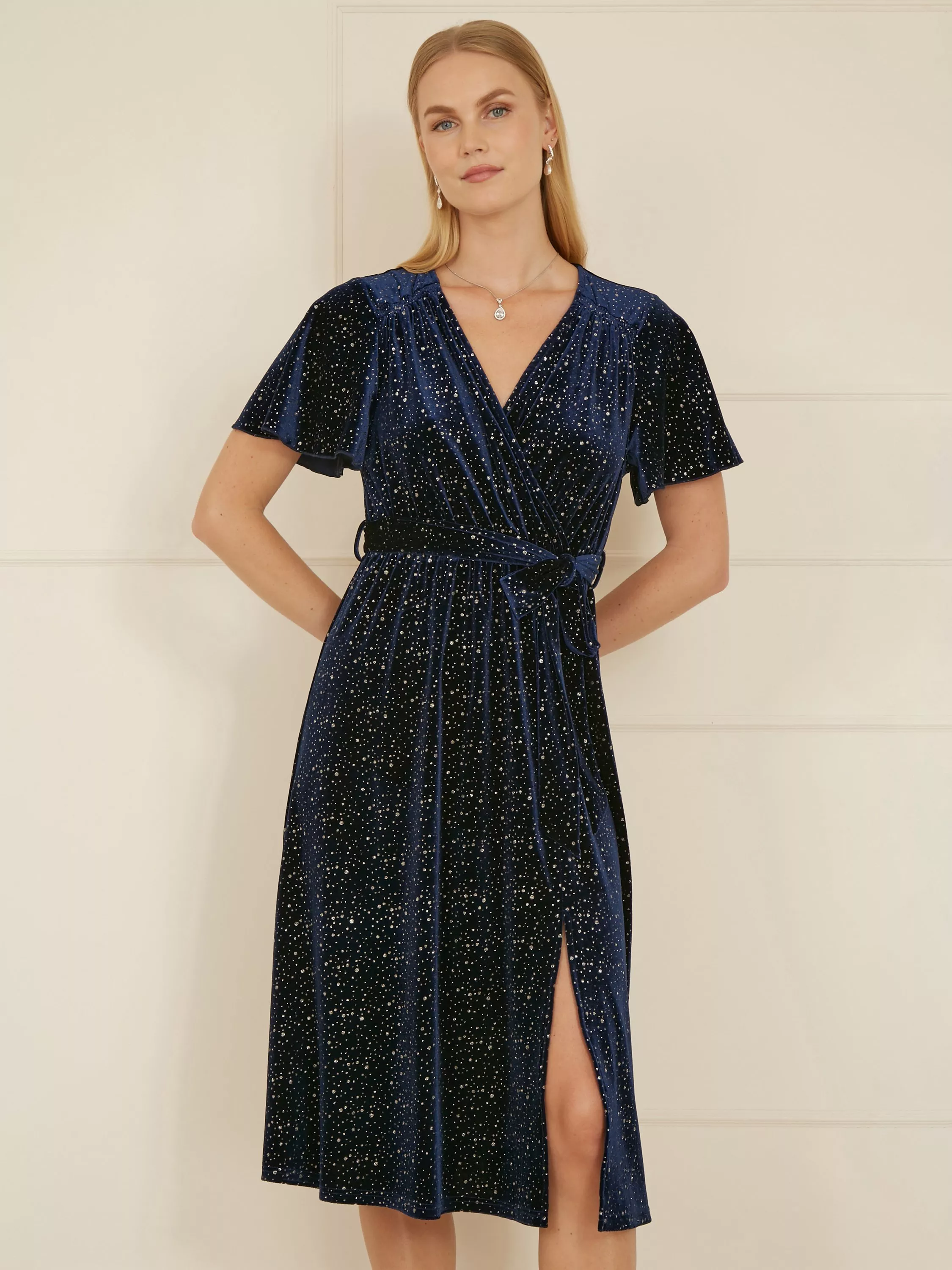 Sparkle like the night sky in this luxurious velvet wrap dress from Yumi, The all over shimmer looks incredible on the super flattering shape. With a midi length hem, tie belt at the waist and soft fluttery angel sleeves. We are obsessed with this for winter weddings, or Christmas parties.