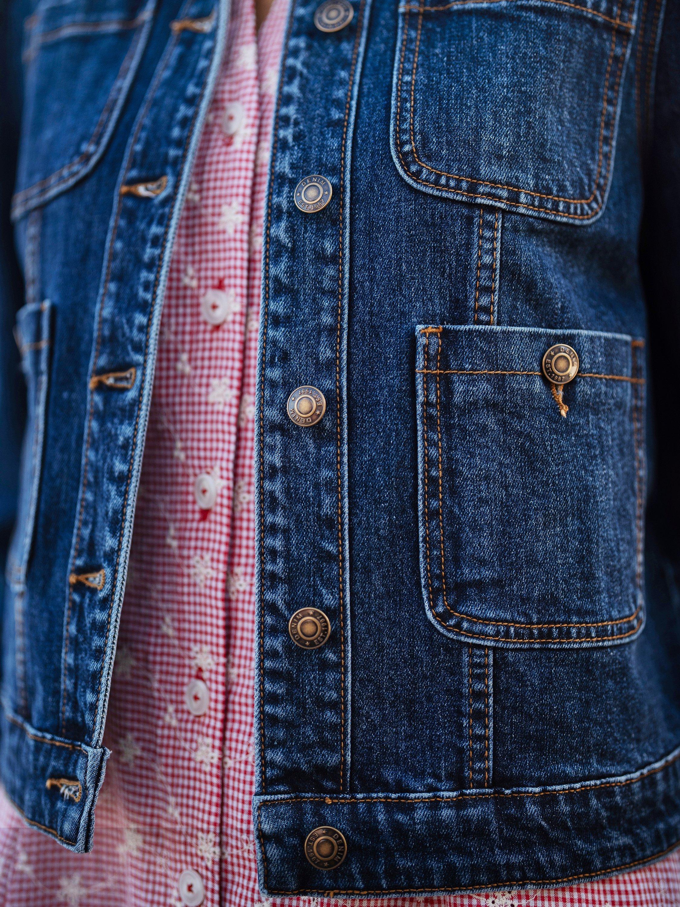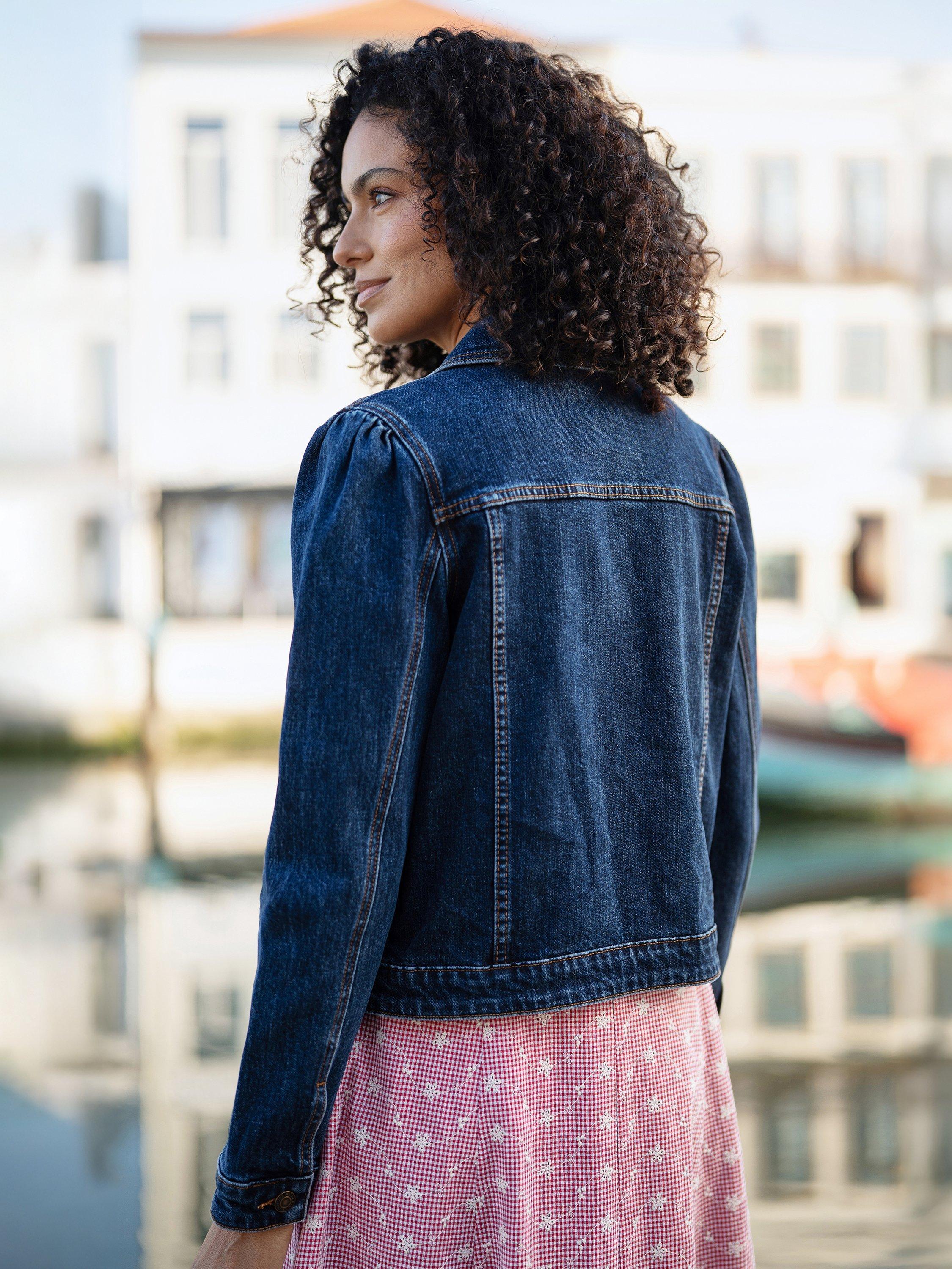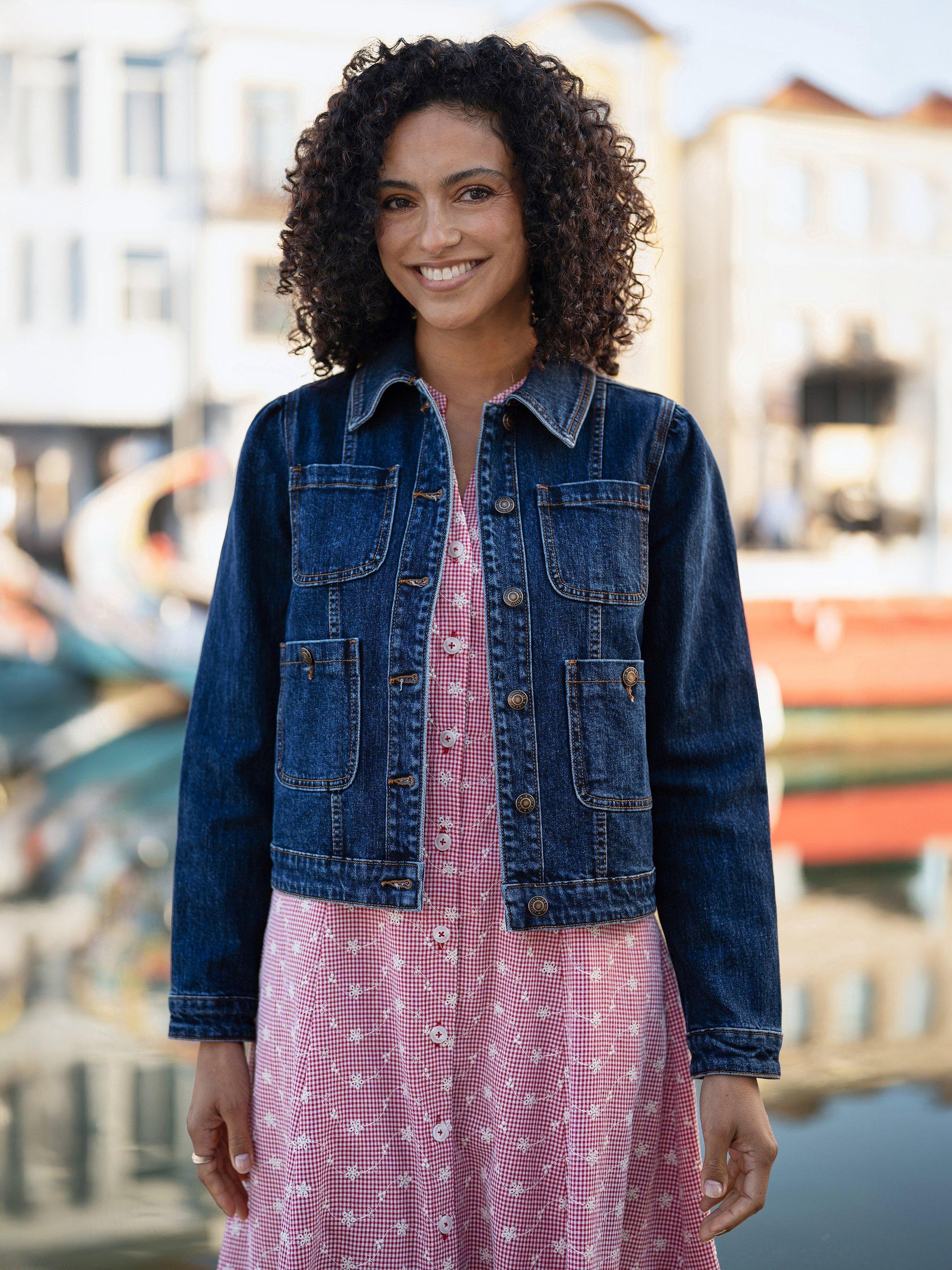 This classic denim jacket brings effortless versatility to any wardrobe, offering a timeless layer that pairs beautifully with dresses, tees, and casual looks. Designed with a flattering, slightly fitted silhouette, it features front patch pockets, button detailing, and a softly structured feel that makes it perfect for everyday wear.