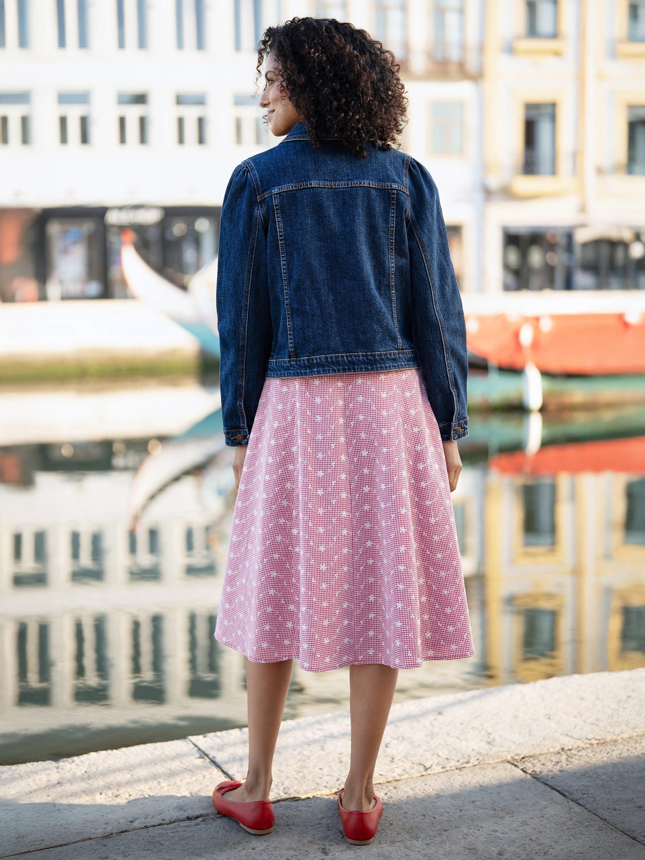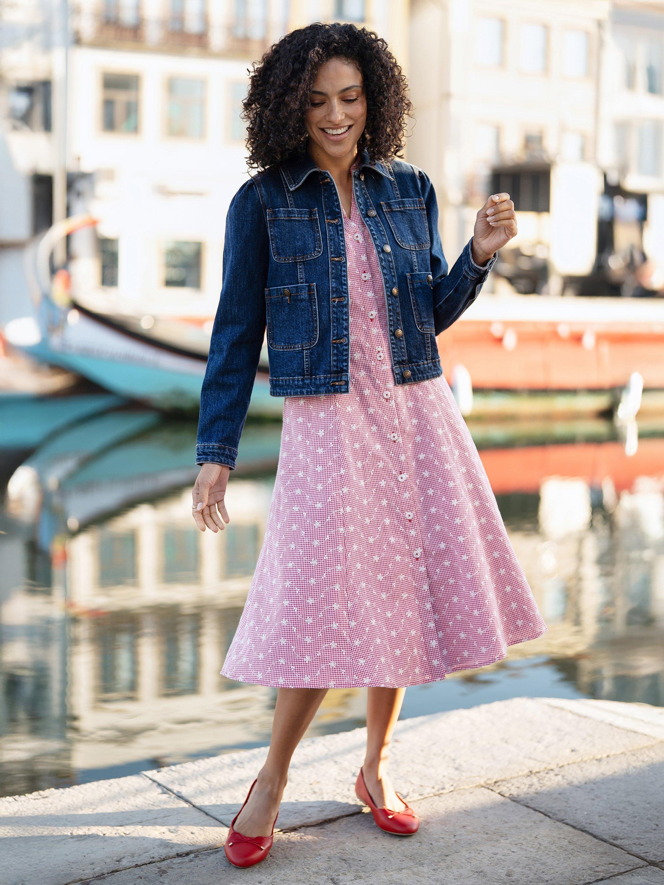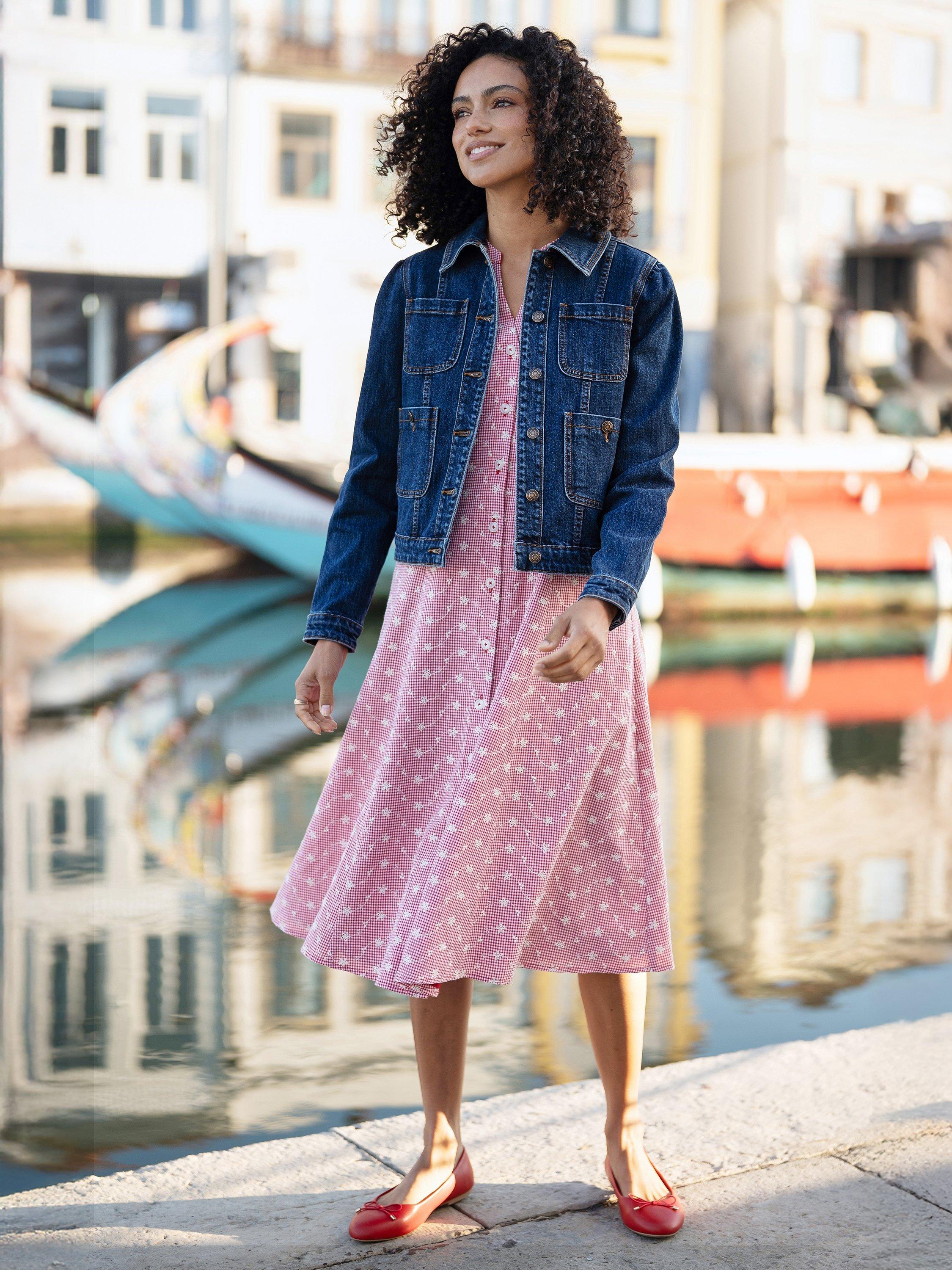 This classic denim jacket brings effortless versatility to any wardrobe, offering a timeless layer that pairs beautifully with dresses, tees, and casual looks. Designed with a flattering, slightly fitted silhouette, it features front patch pockets, button detailing, and a softly structured feel that makes it perfect for everyday wear.