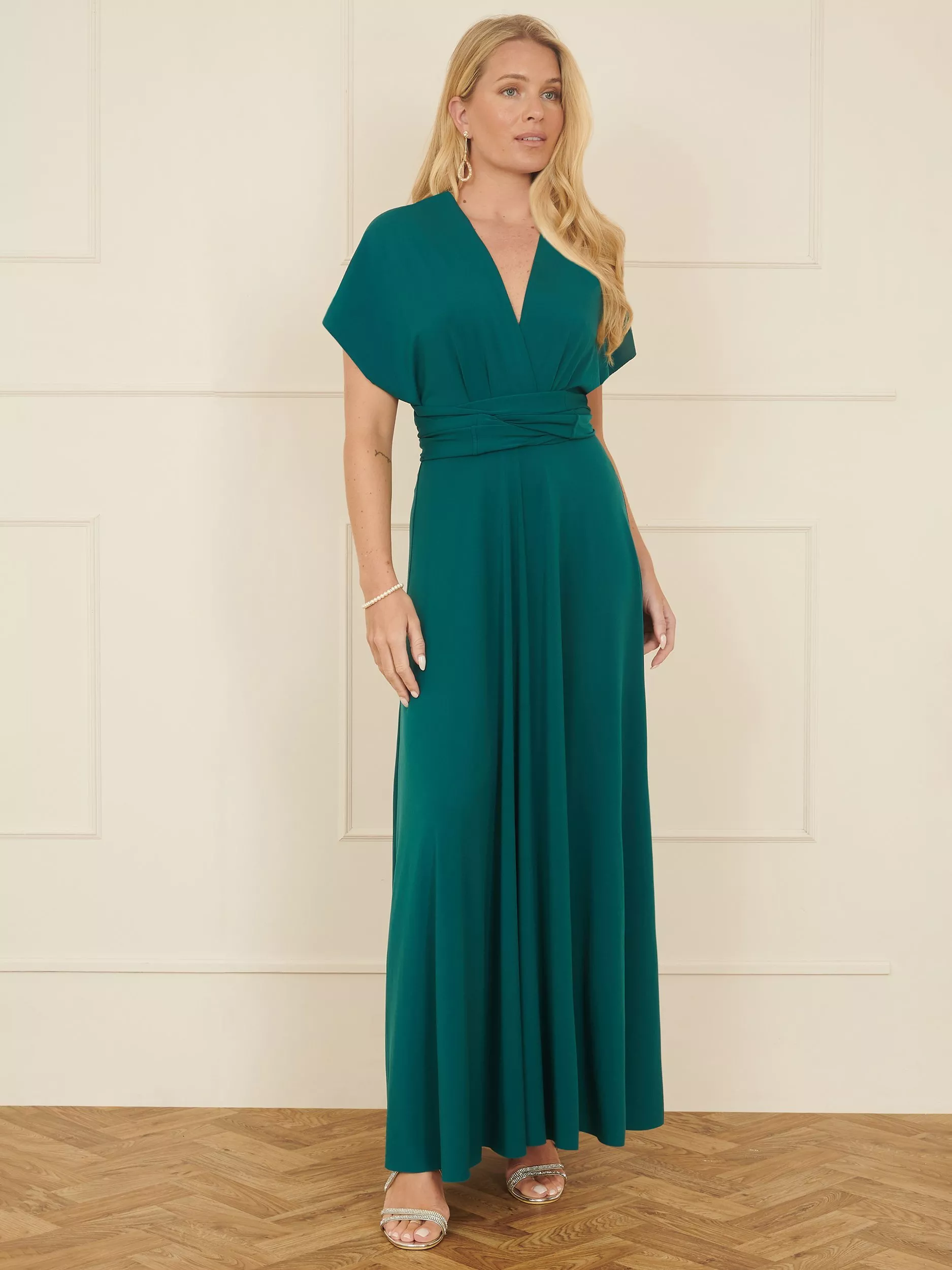 Looking for a dress that truly does it all? This is the one for you - The unique design offers a multitude of ways to wear, off the shoulder, wrap around, halter neck. The stretch jersey fabric feels and looks amazing styled anyway. In a midi length, this is the ultimate girls best wardrobe friend. Perfect for bridesmaids, or wedding guest alike.