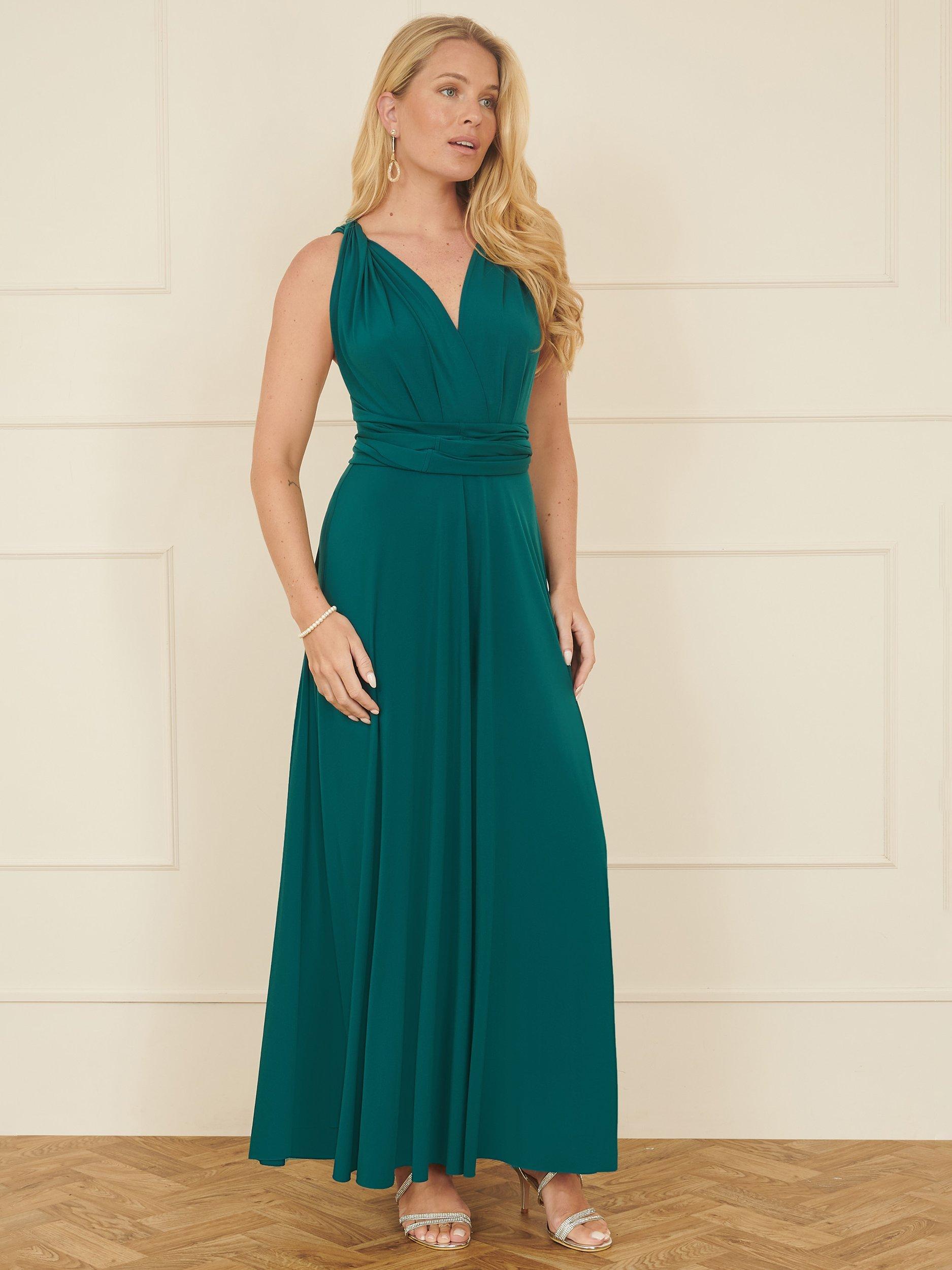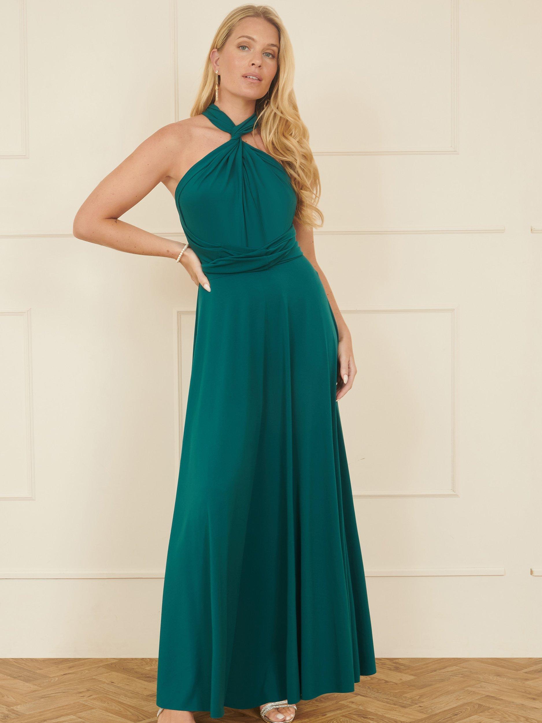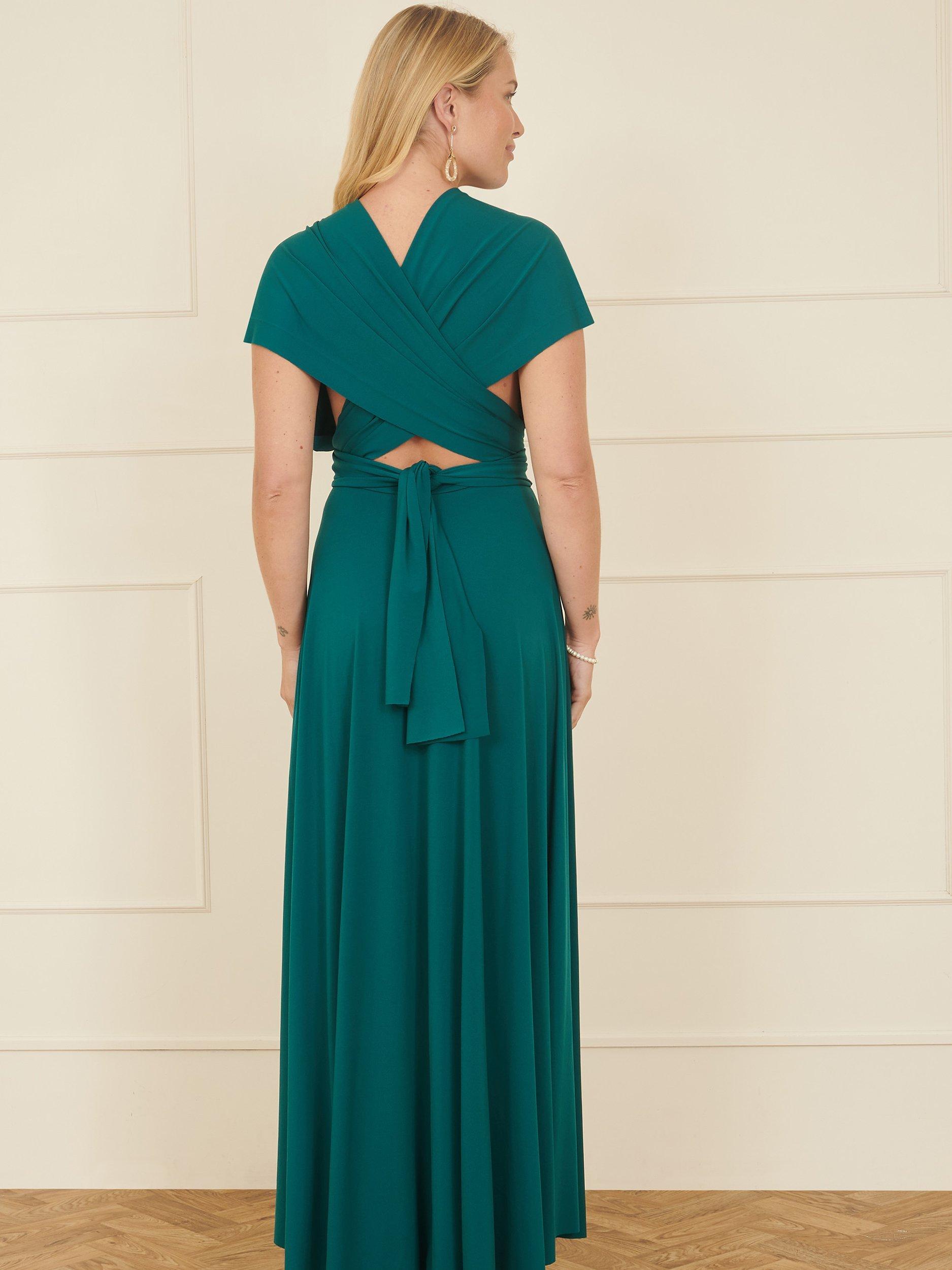 Looking for a dress that truly does it all? This is the one for you - The unique design offers a multitude of ways to wear, off the shoulder, wrap around, halter neck. The stretch jersey fabric feels and looks amazing styled anyway. In a midi length, this is the ultimate girls best wardrobe friend. Perfect for bridesmaids, or wedding guest alike.
