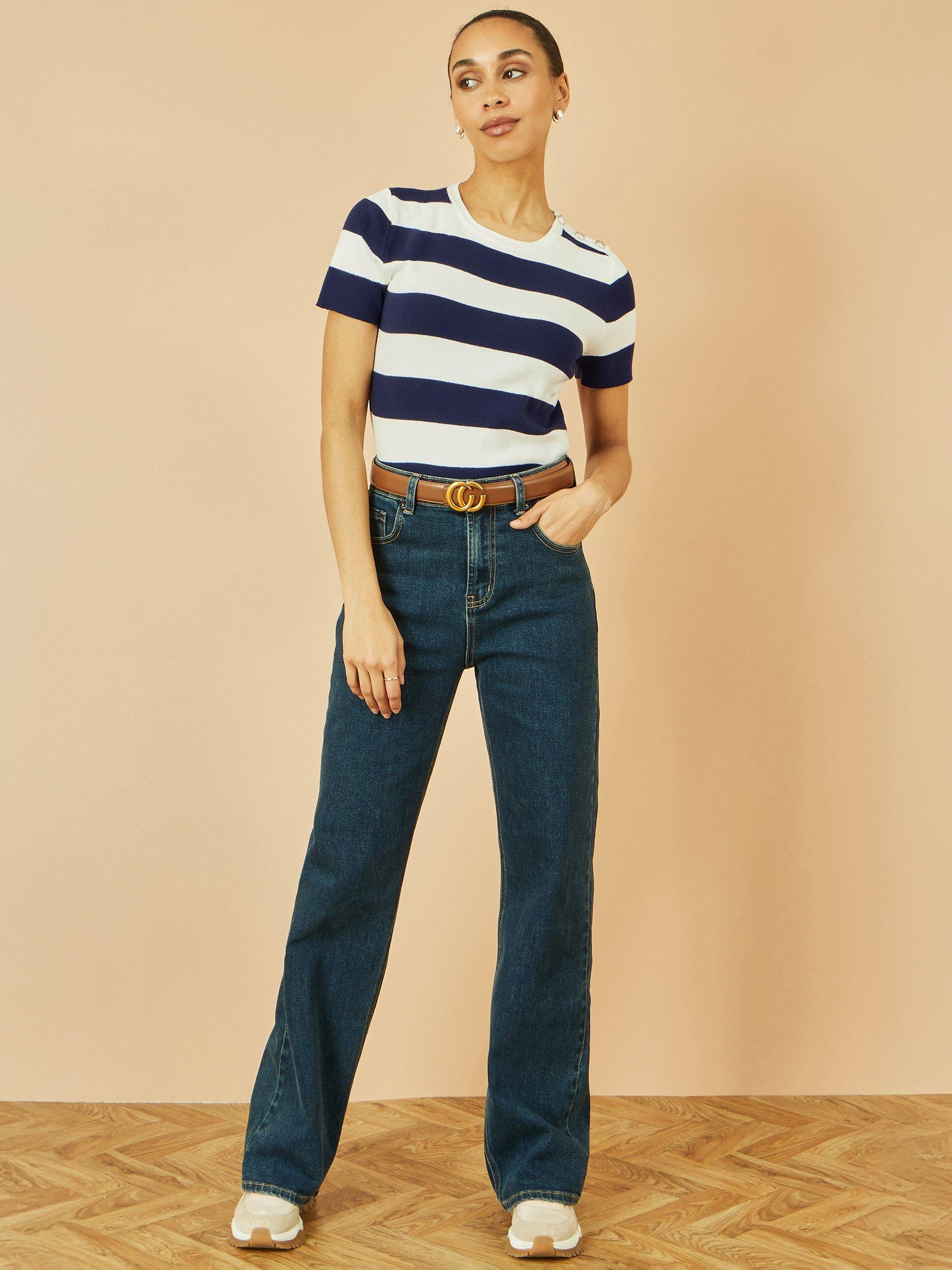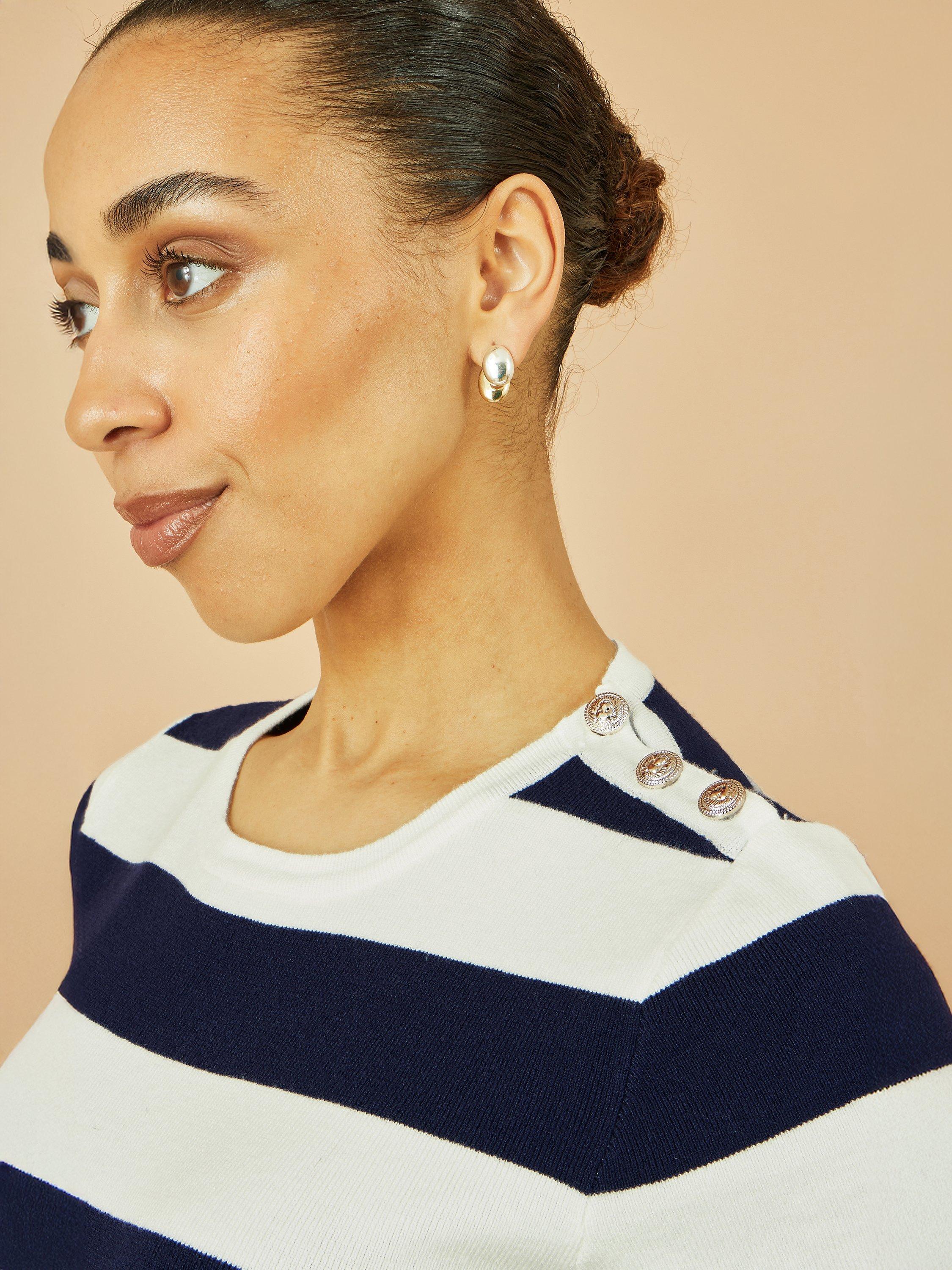 This fine knitted top for Yumi will be your go-to for everyday with jeans this season. The block stripe is bang on trend, with cute button detailing on the shoulder to complete the nod to a nautical look. In a simple T-shirt style, this versatile top is flattering and easy to wear.