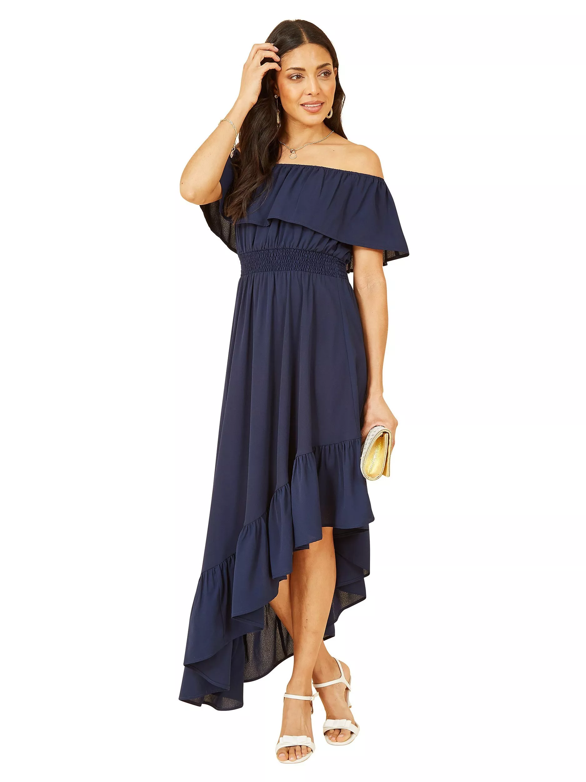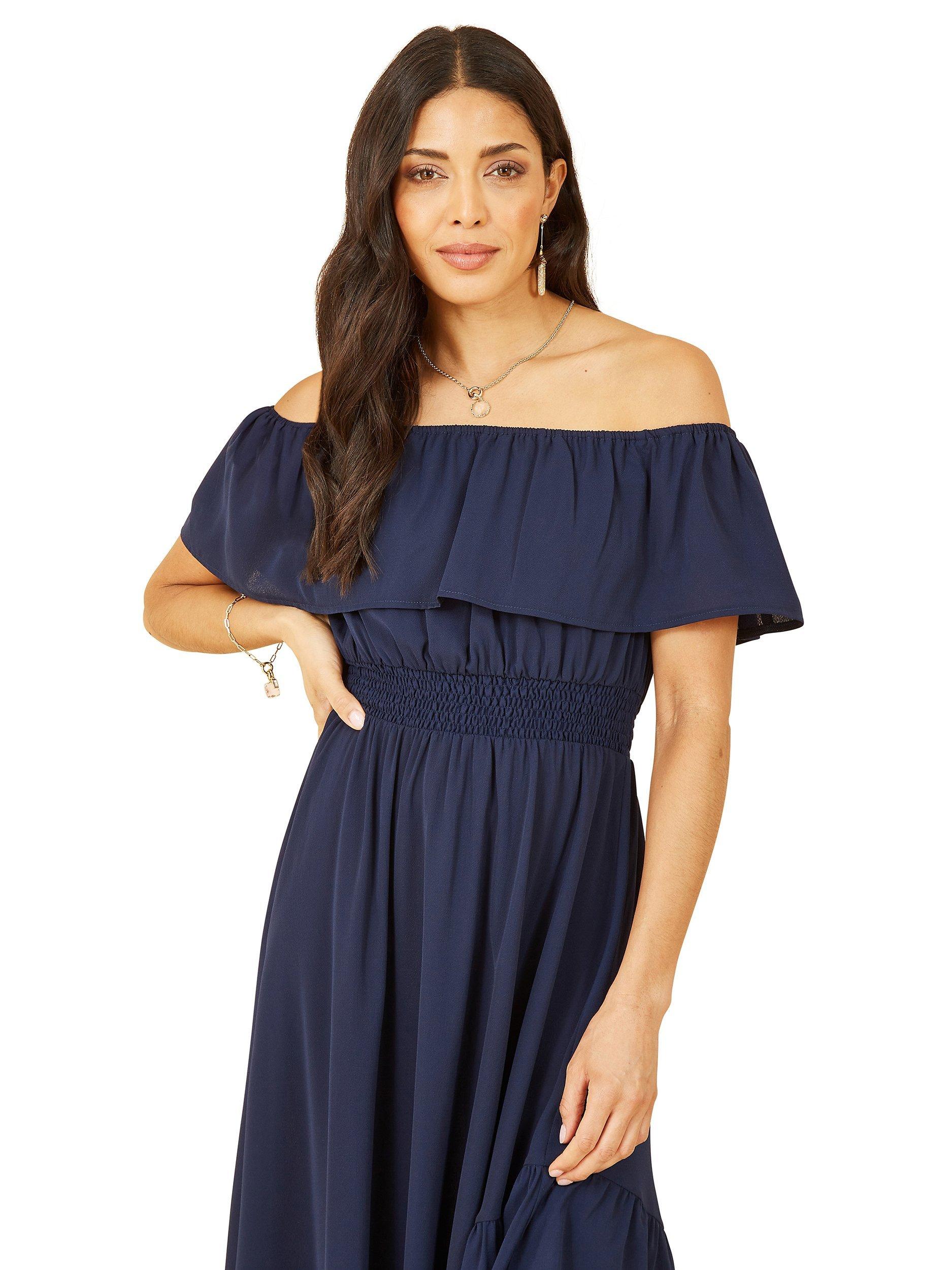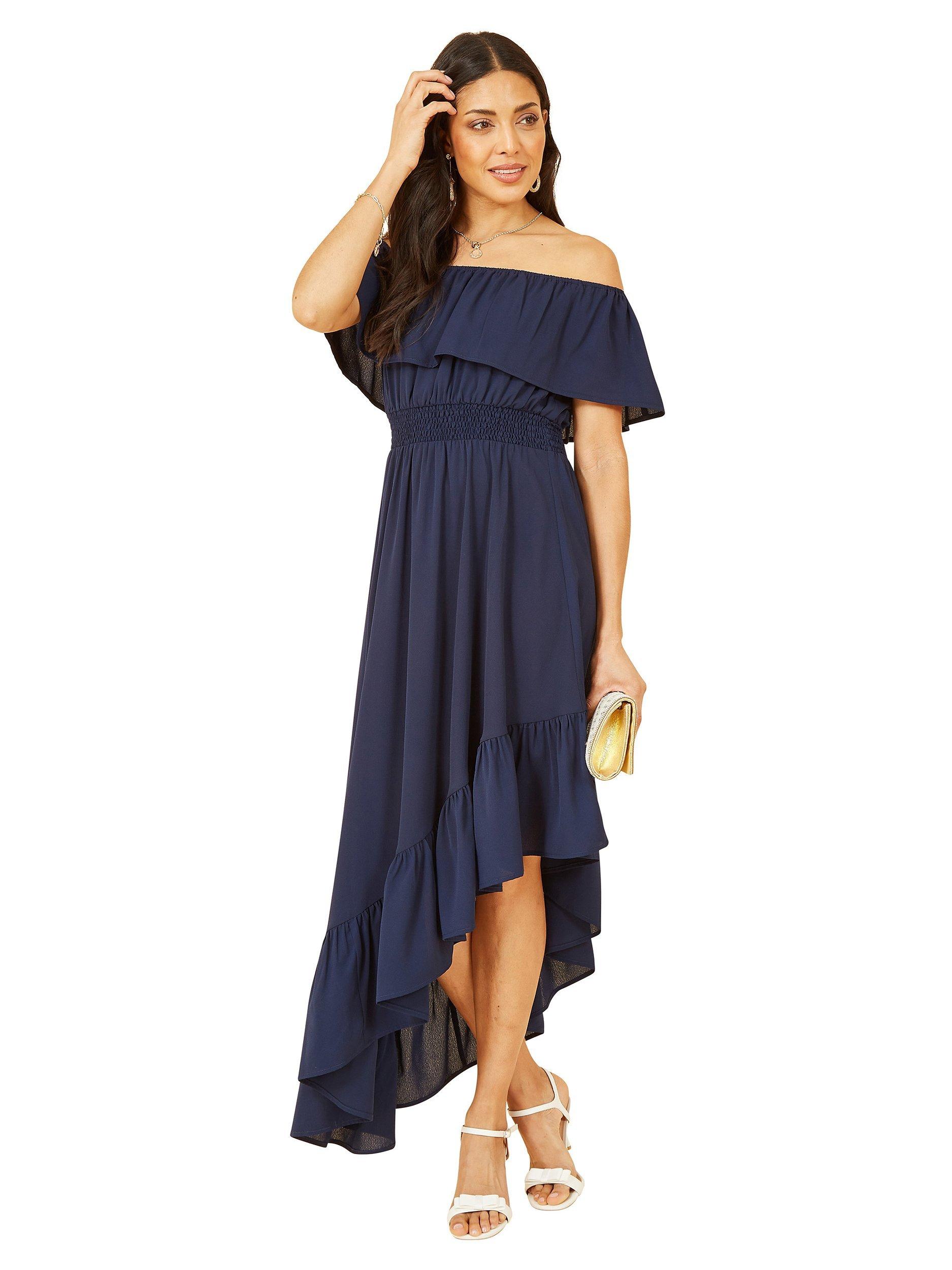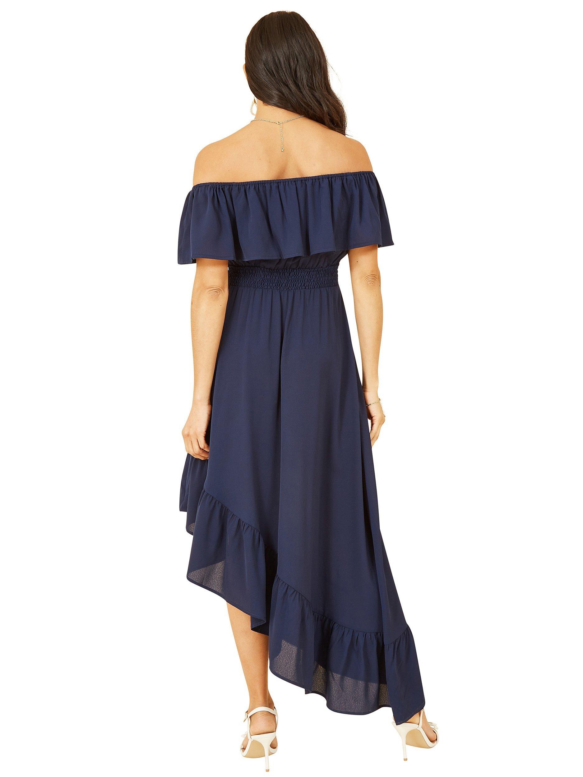 Falling to a ruffled, asymmetrical hem, this midi dress from Yumi is made to withstand plenty of wear (and washing for that matter). Showcasing the shoulders with its bardot neckline and drop sleeves, it is free of unnecessary embellishments.