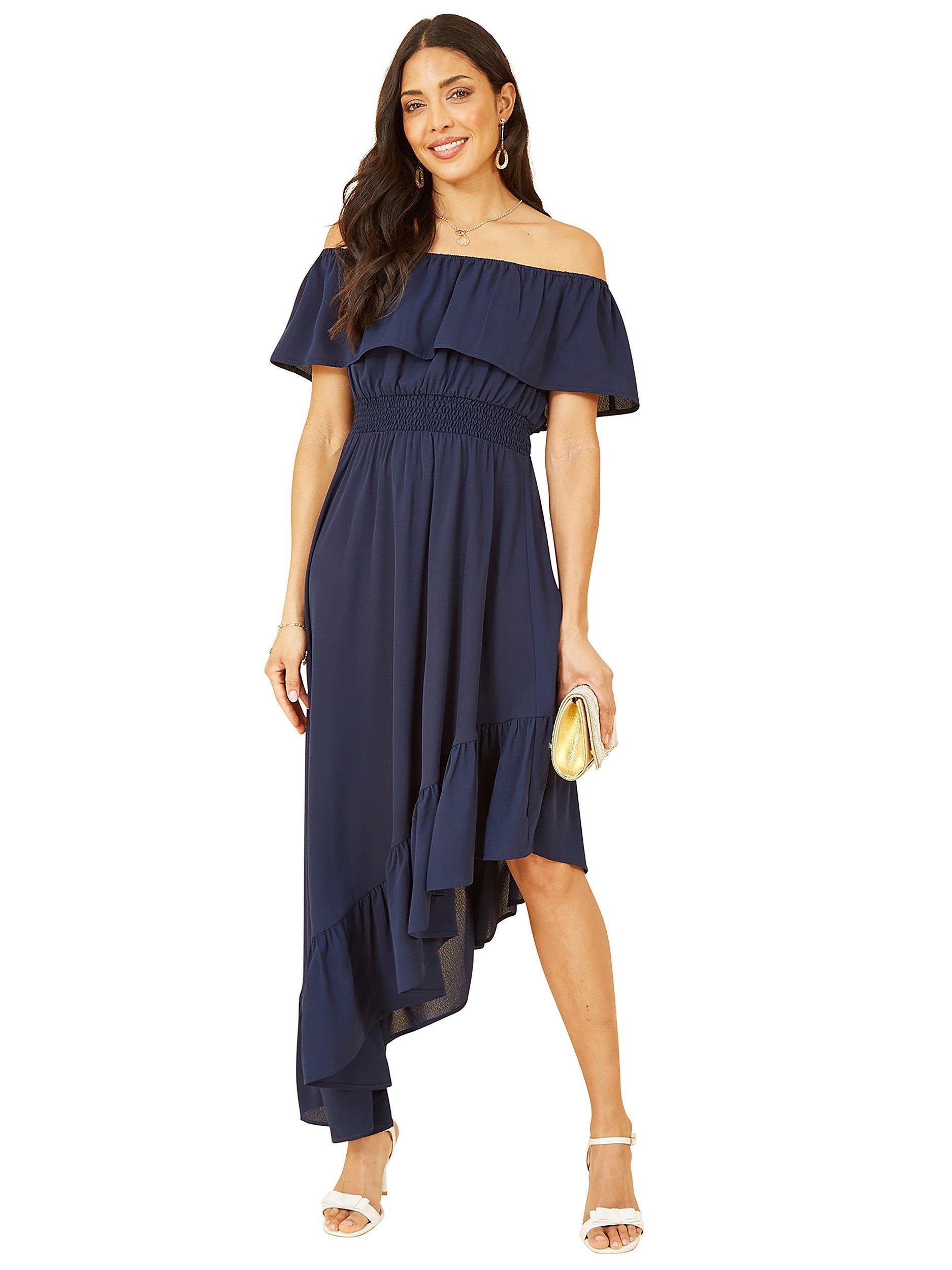 YumiTiered Ruffled Bardot Asymmetric Dress, Navy