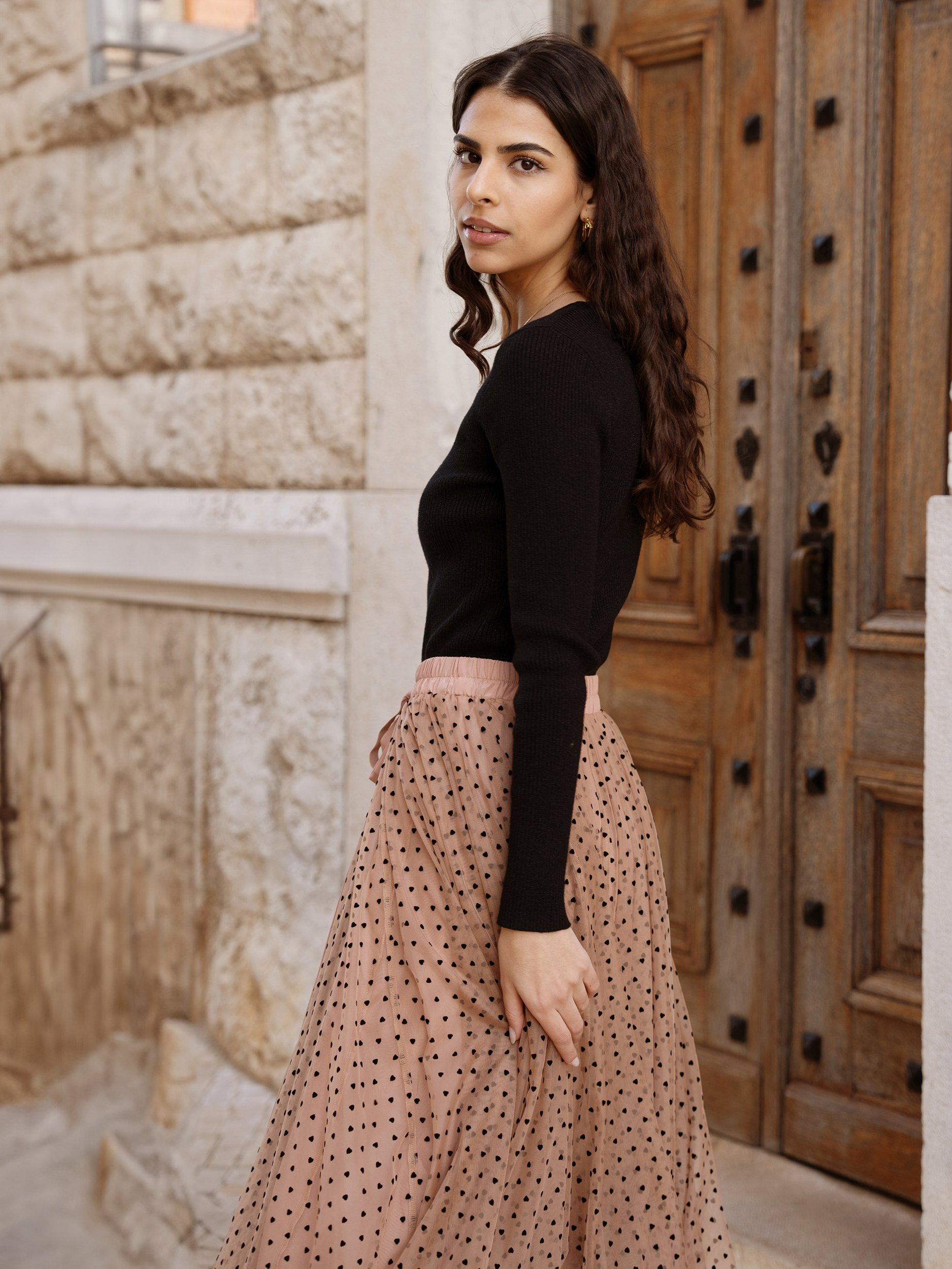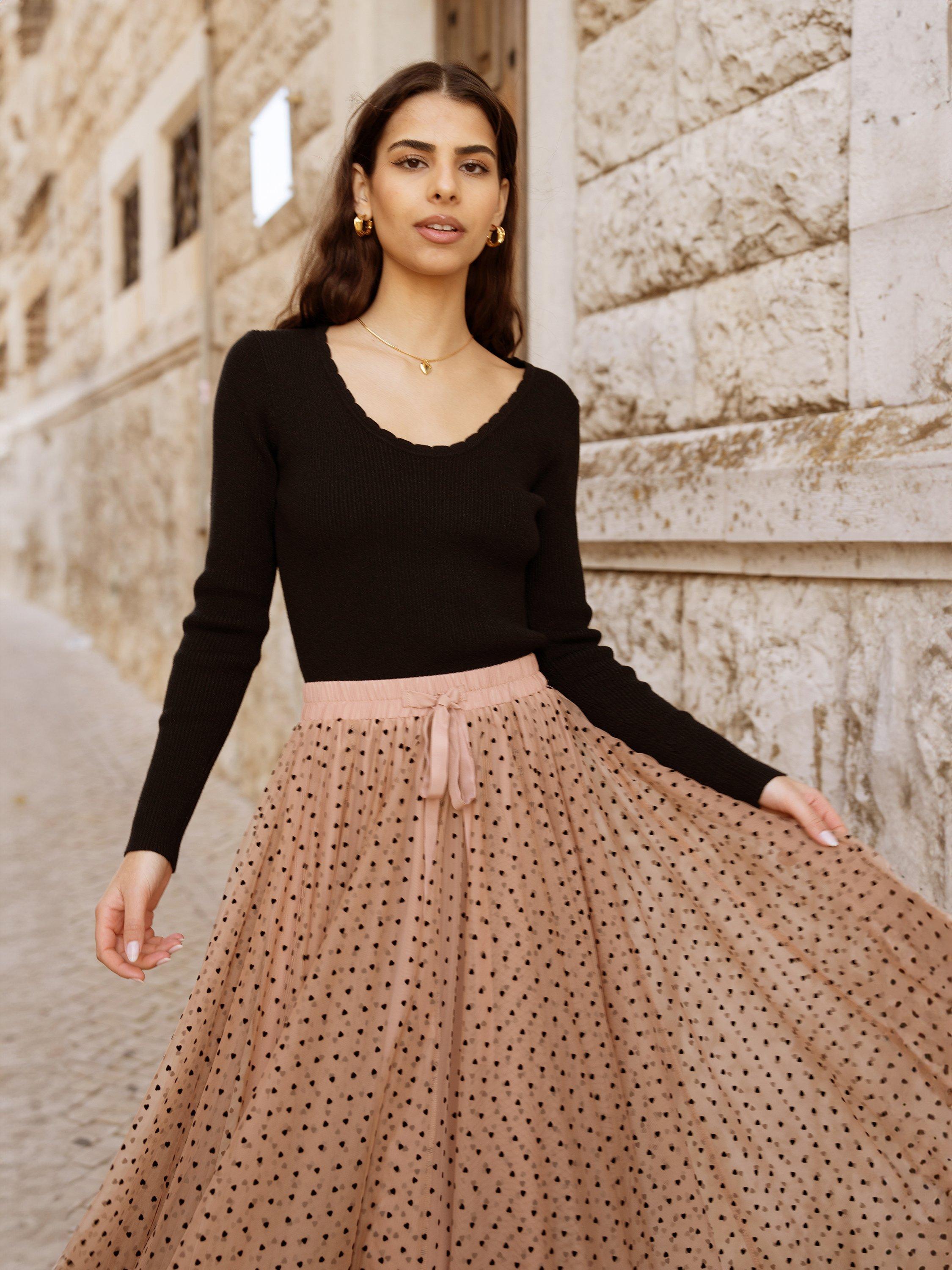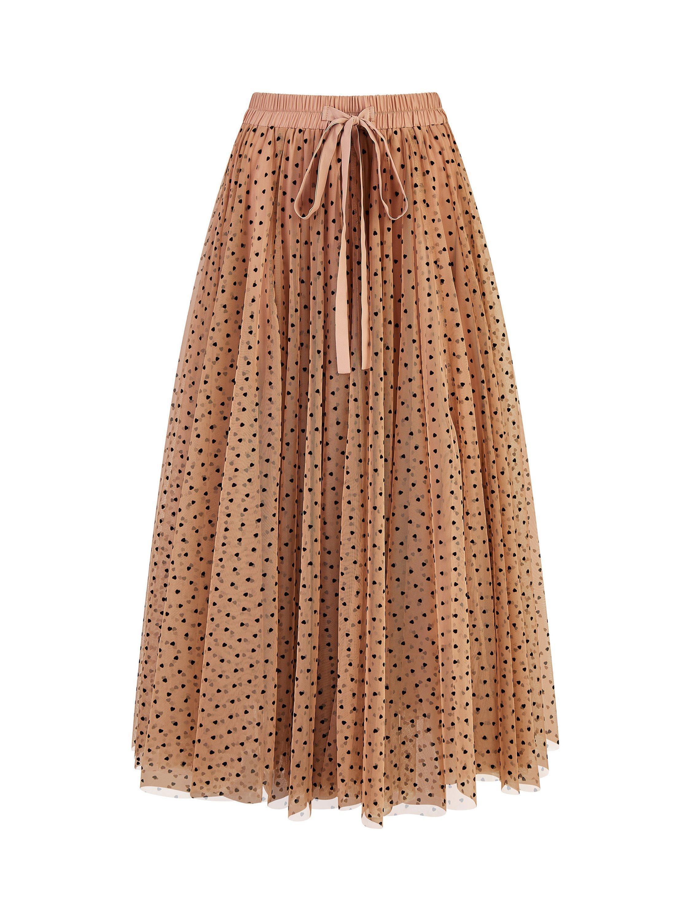 If elevated romantic style is your vibe for the new season - this is the perfect style for your wardrobe. This midi-length skirt boasts a flirty and mega-feminine feel, made from luxurious tulle with a cute heart print. Style with a long-sleeved roll neck for the ultimate elegant look. We love this style for autumn weddings and special occasions.