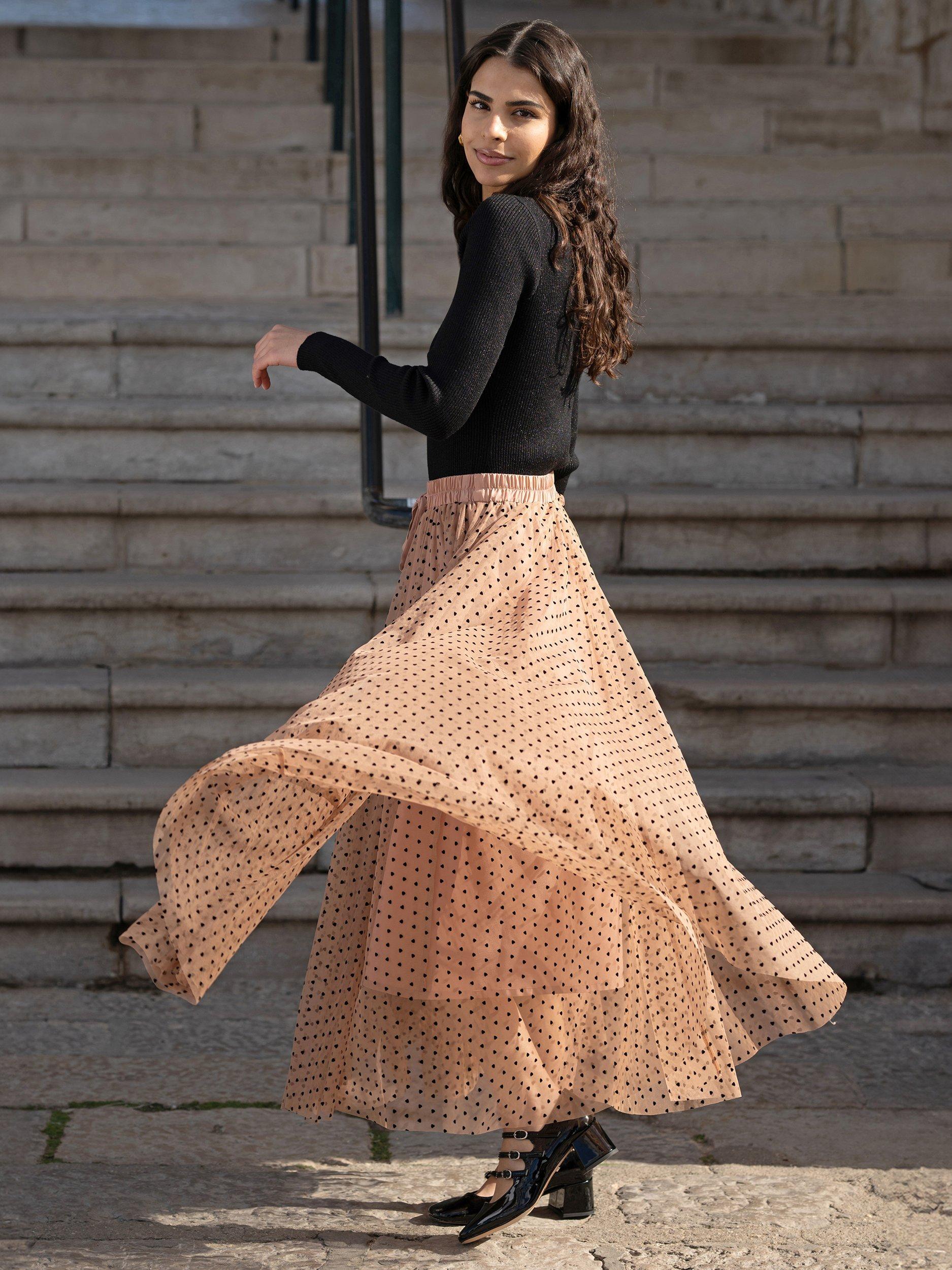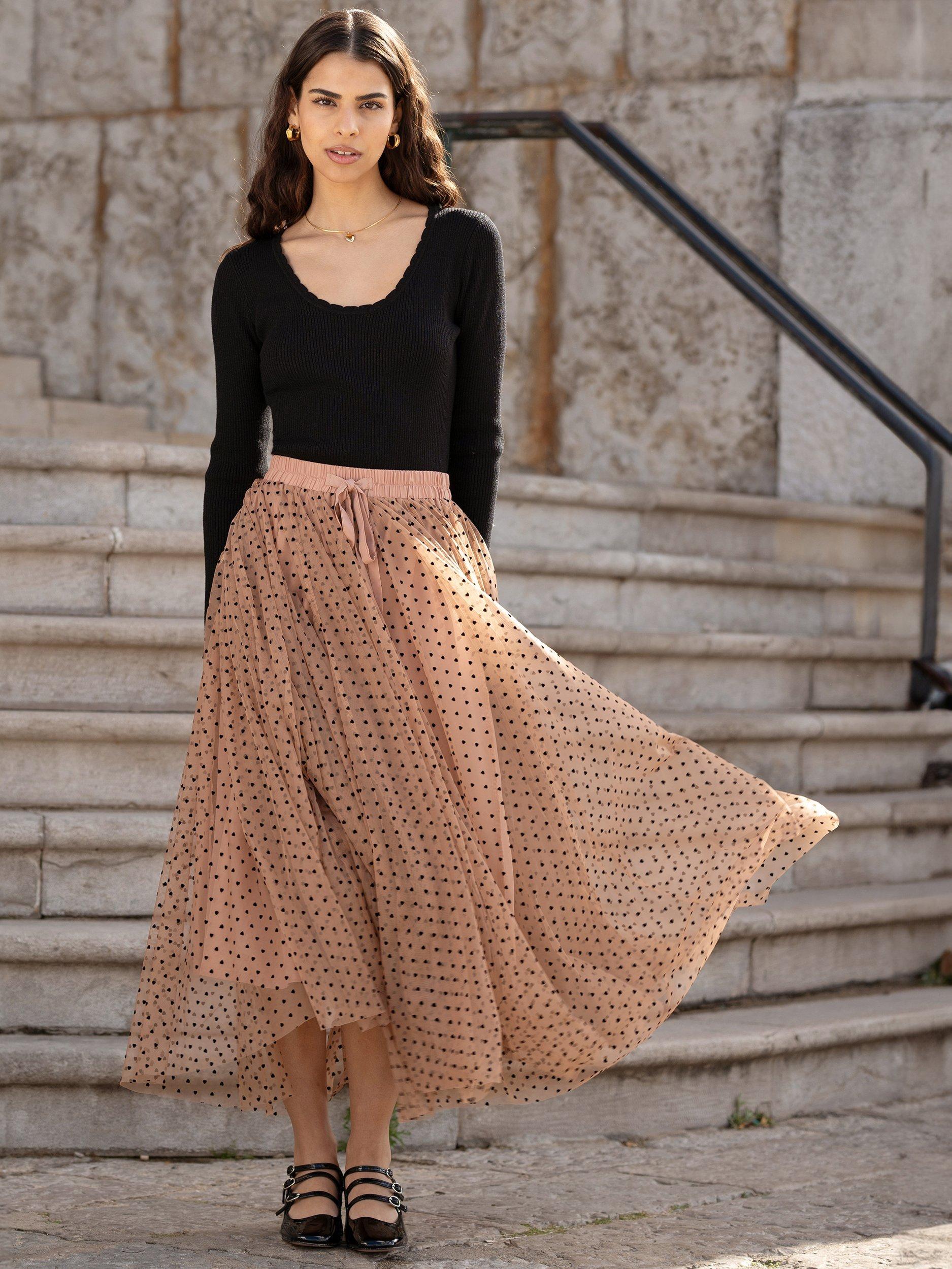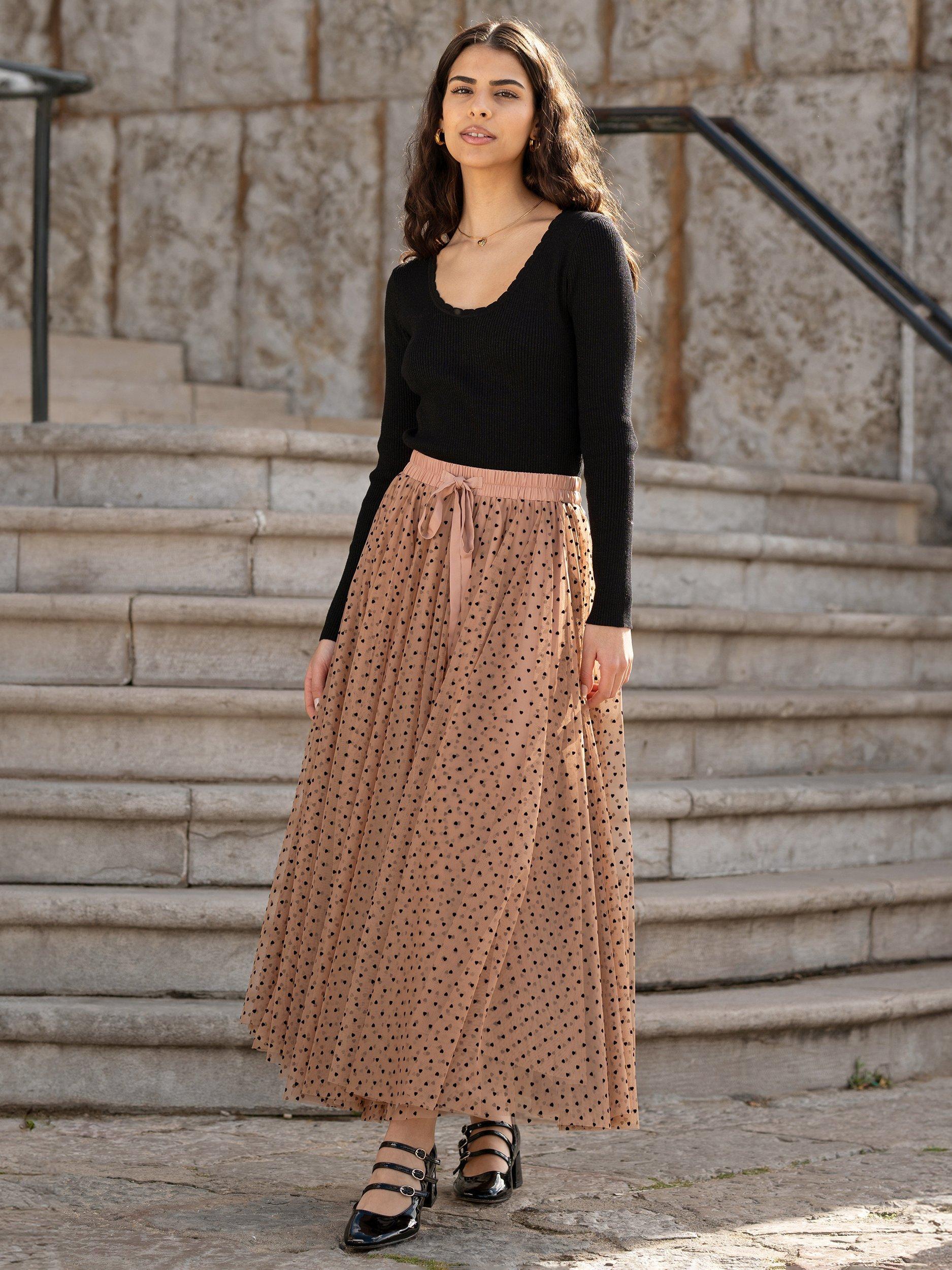 If elevated romantic style is your vibe for the new season - this is the perfect style for your wardrobe. This midi-length skirt boasts a flirty and mega-feminine feel, made from luxurious tulle with a cute heart print. Style with a long-sleeved roll neck for the ultimate elegant look. We love this style for autumn weddings and special occasions.