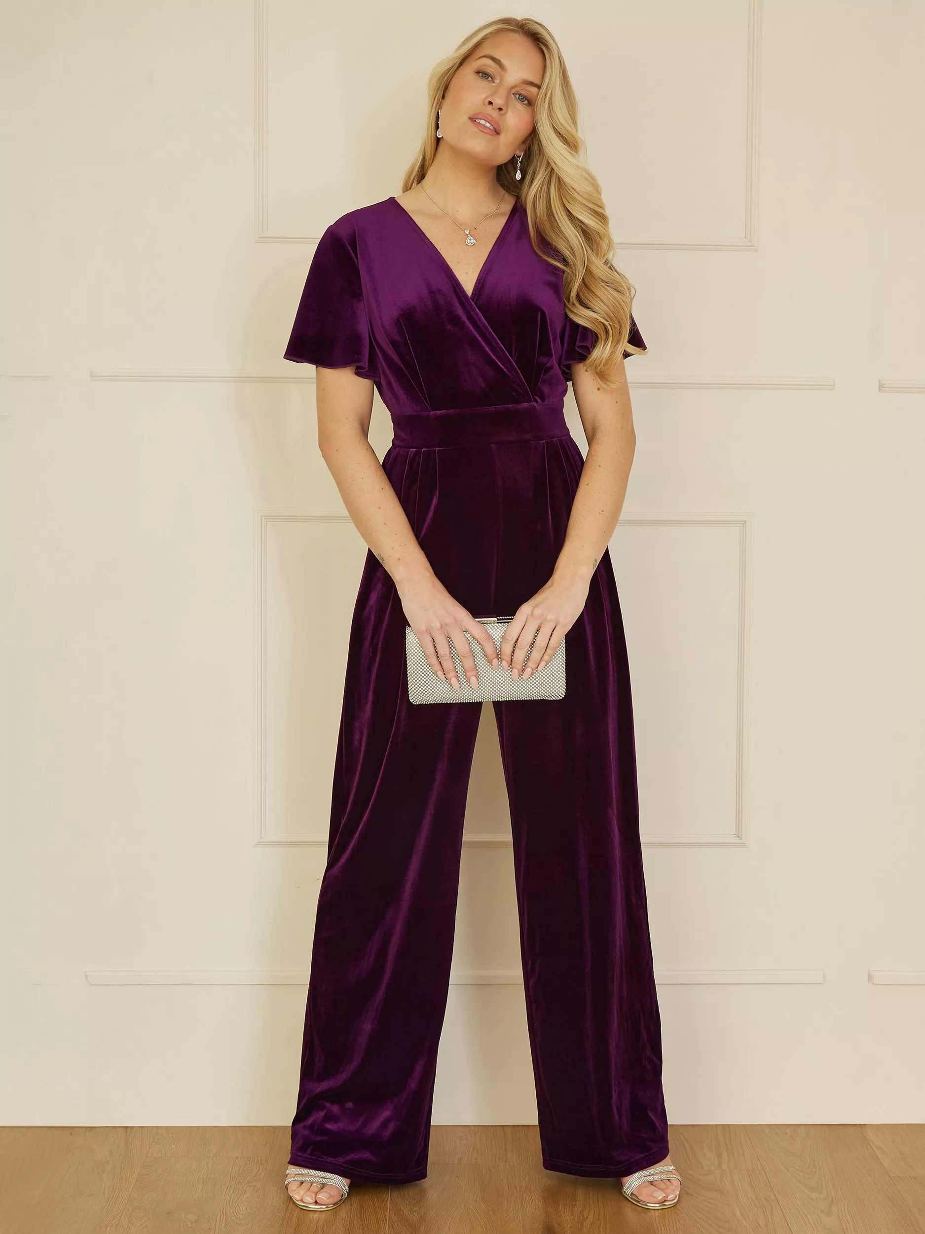 Perfect for parties, this stunning Yumi Jumpsuit With Angel Sleeves comes in a striking velvet. With a super flattering wrap style top, wide-legged trousers, a fitted waist and flared angel sleeves, this all-in-one is a fabulous festive fit. Pair with leather wedges and a matching clutch to complete the look.