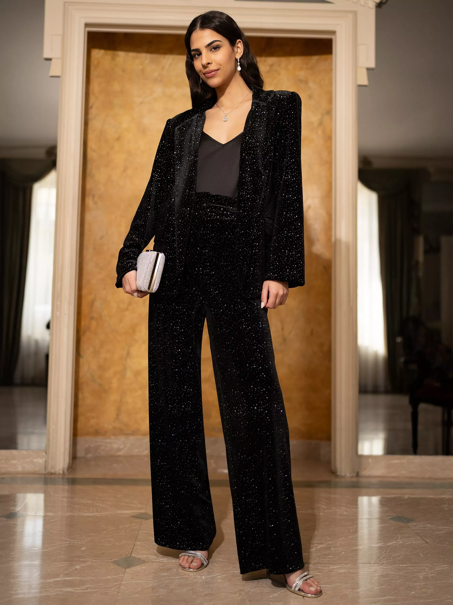 Covered in a sparkle foil print these trousers are gorgeous for party season - They look spectacular under low light, shimmer and sparkling. The wide leg fit in bang on trend and have been crafted from a luxurious feeling stretch velvet, with pockets for a comfortable fit.