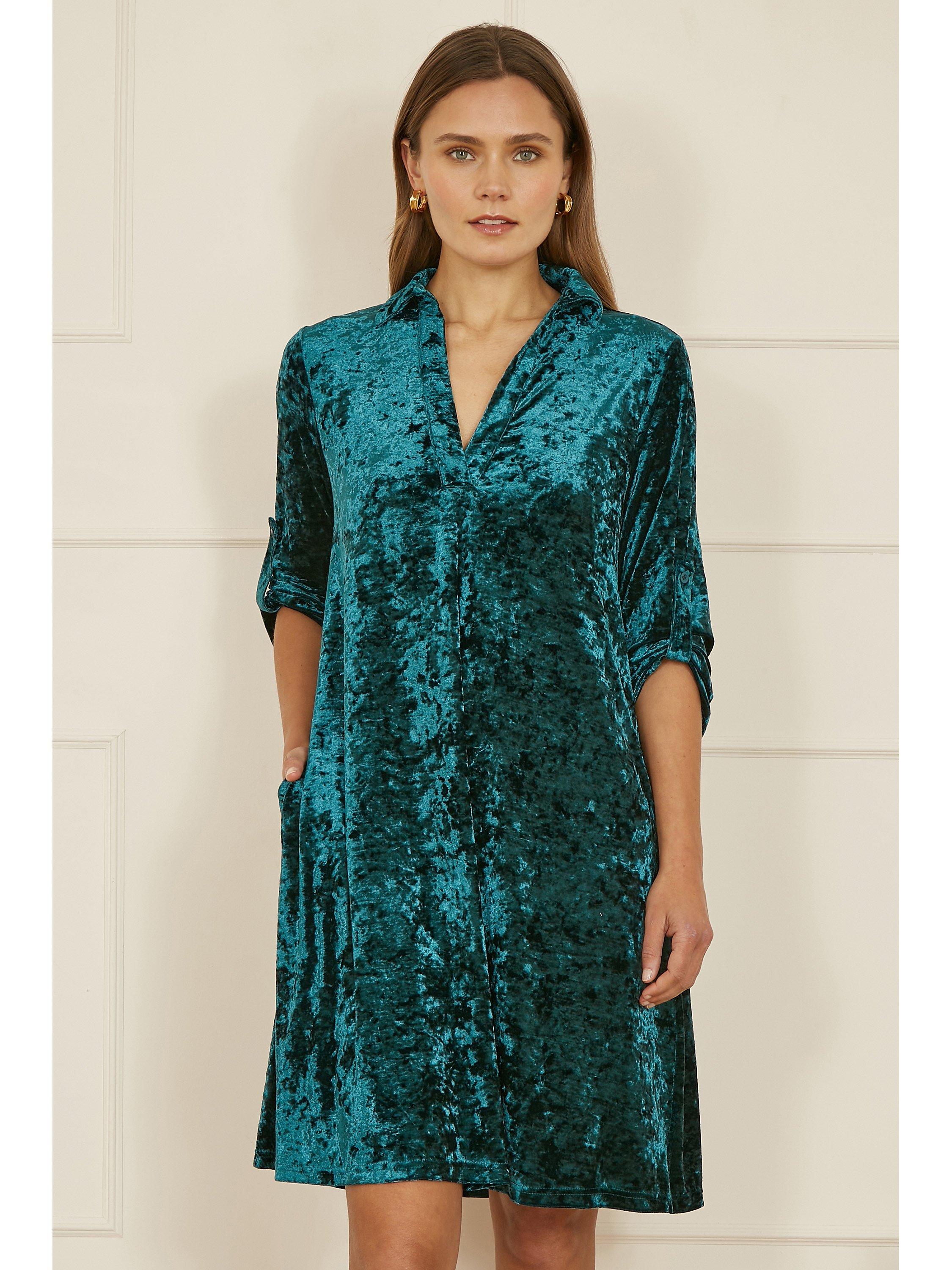 Elevate your everyday outfit with gorgeous feeling luxe velvet. In a simple and stylish tunic shape, that has a 3/4 sleeve that can be cuffed and buttoned. The V neck collared neckline is smart feature and looks great underneath a blazer. Stye with boots and tights.