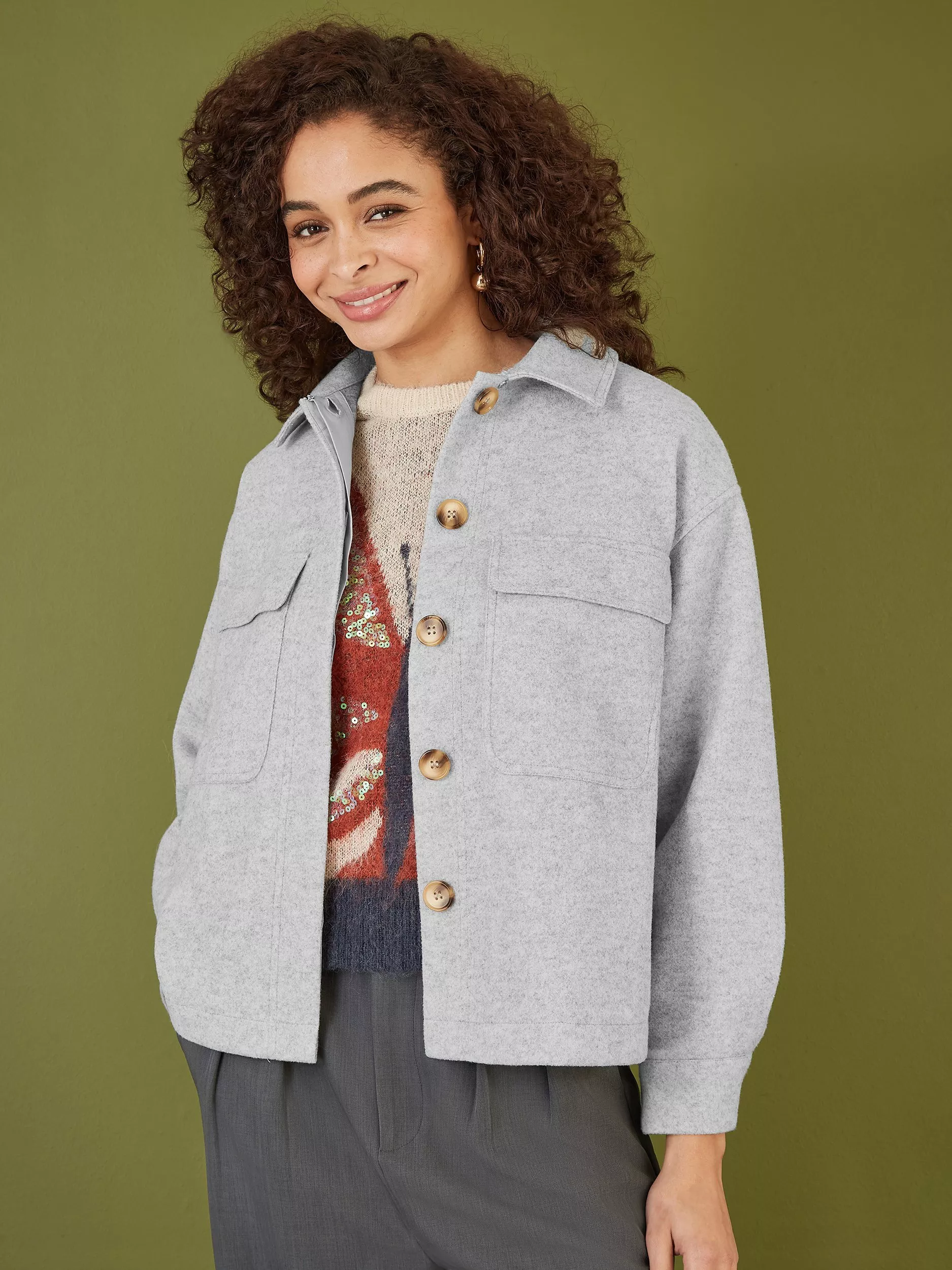 If you're looking for that perfect lightweight jacket for the changing seasons, let us introduce you to this gorgeous shacket from Yumi! The soft colour goes perfectly with any outfit, with a slightly cropped hemline, simple design topped off with over sized pockets in the front. This shirt style jacket has a concealed button up fastening for a chic finish.