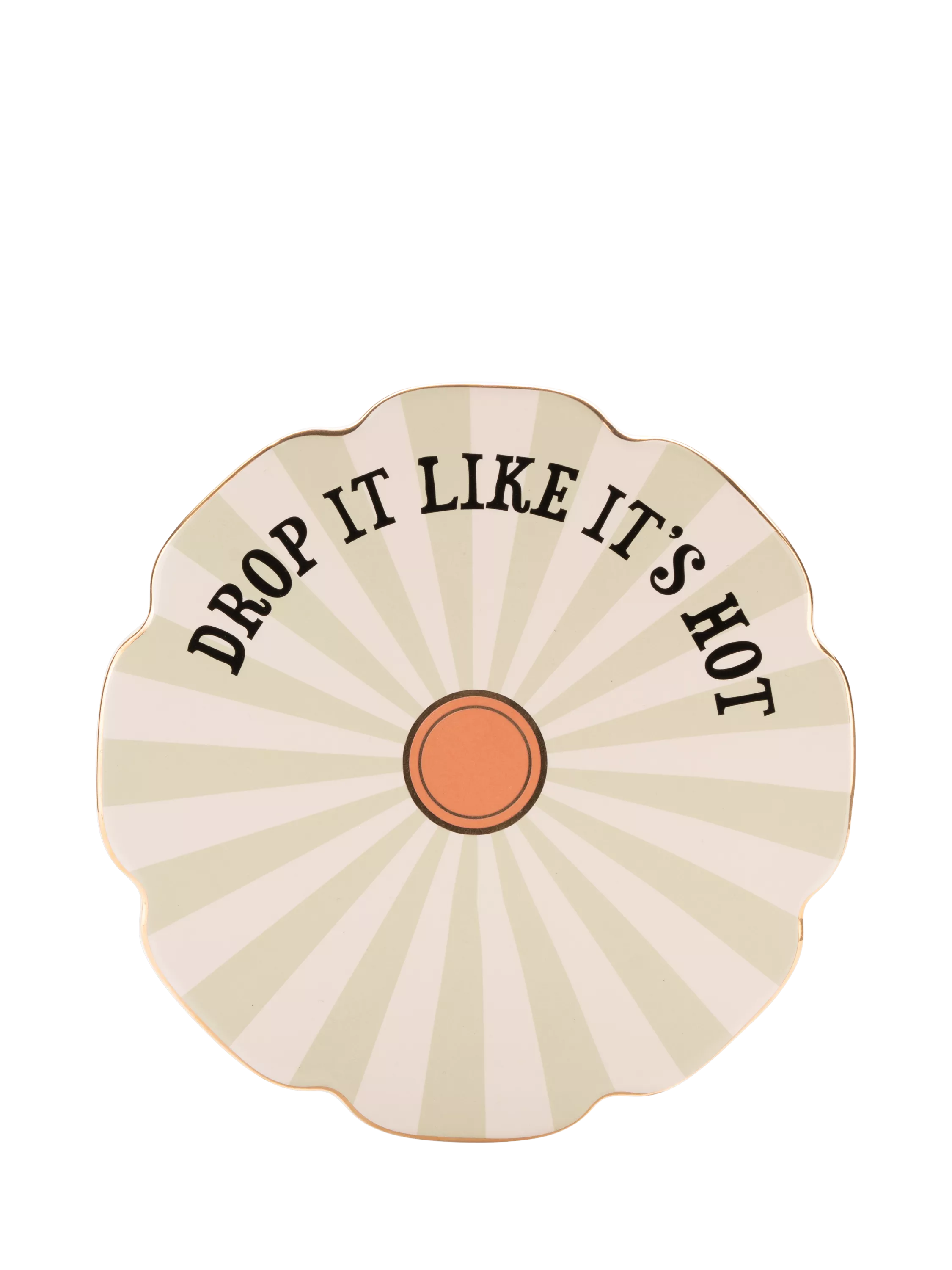 Stylish heat protection with attitude. Made of striped stoneware with a cork backing, this scallop-edged trivet features a cheeky slogan, gold-toned accents, and a design that's perfect for kitchen counters or dinner tables.