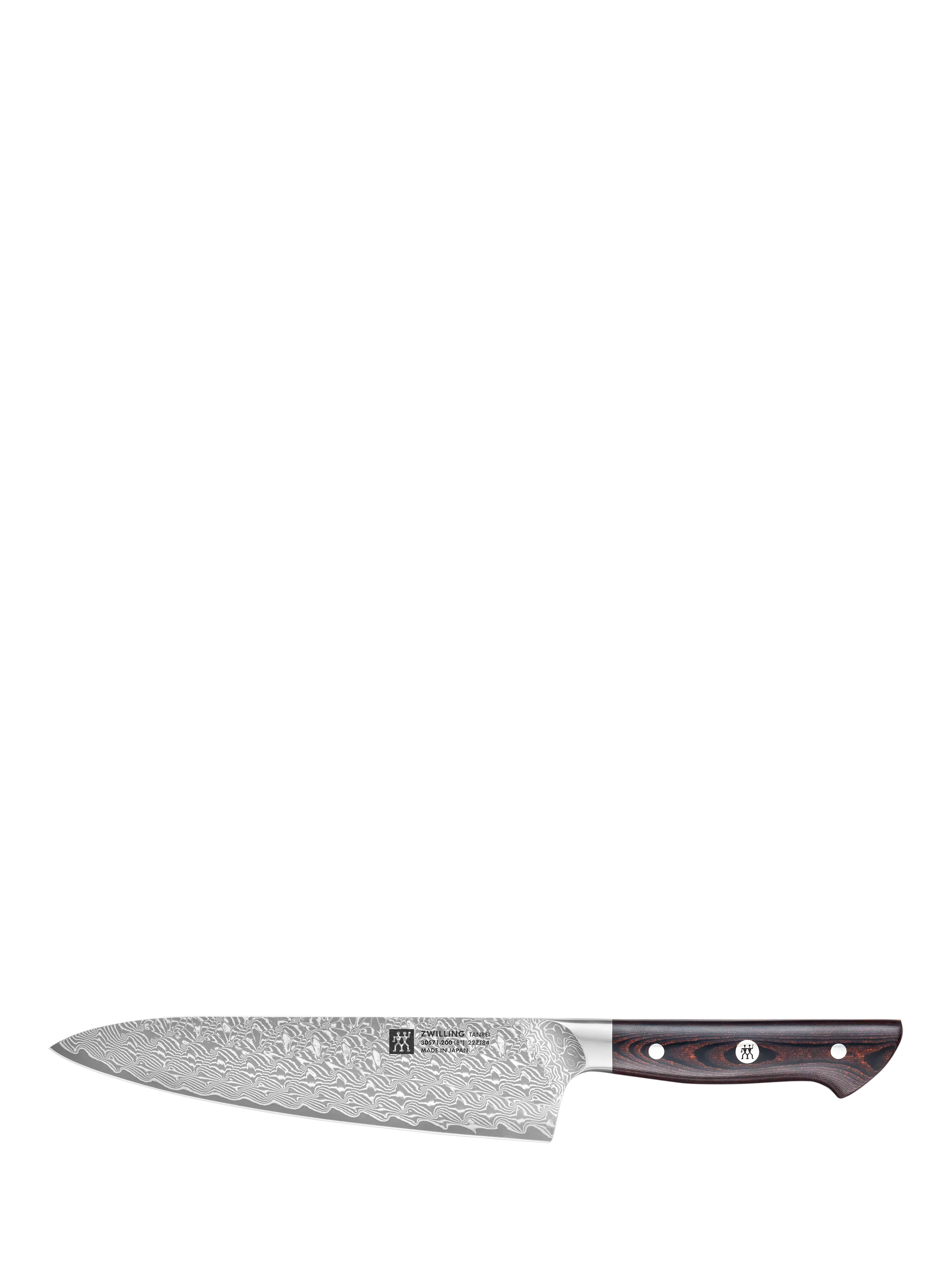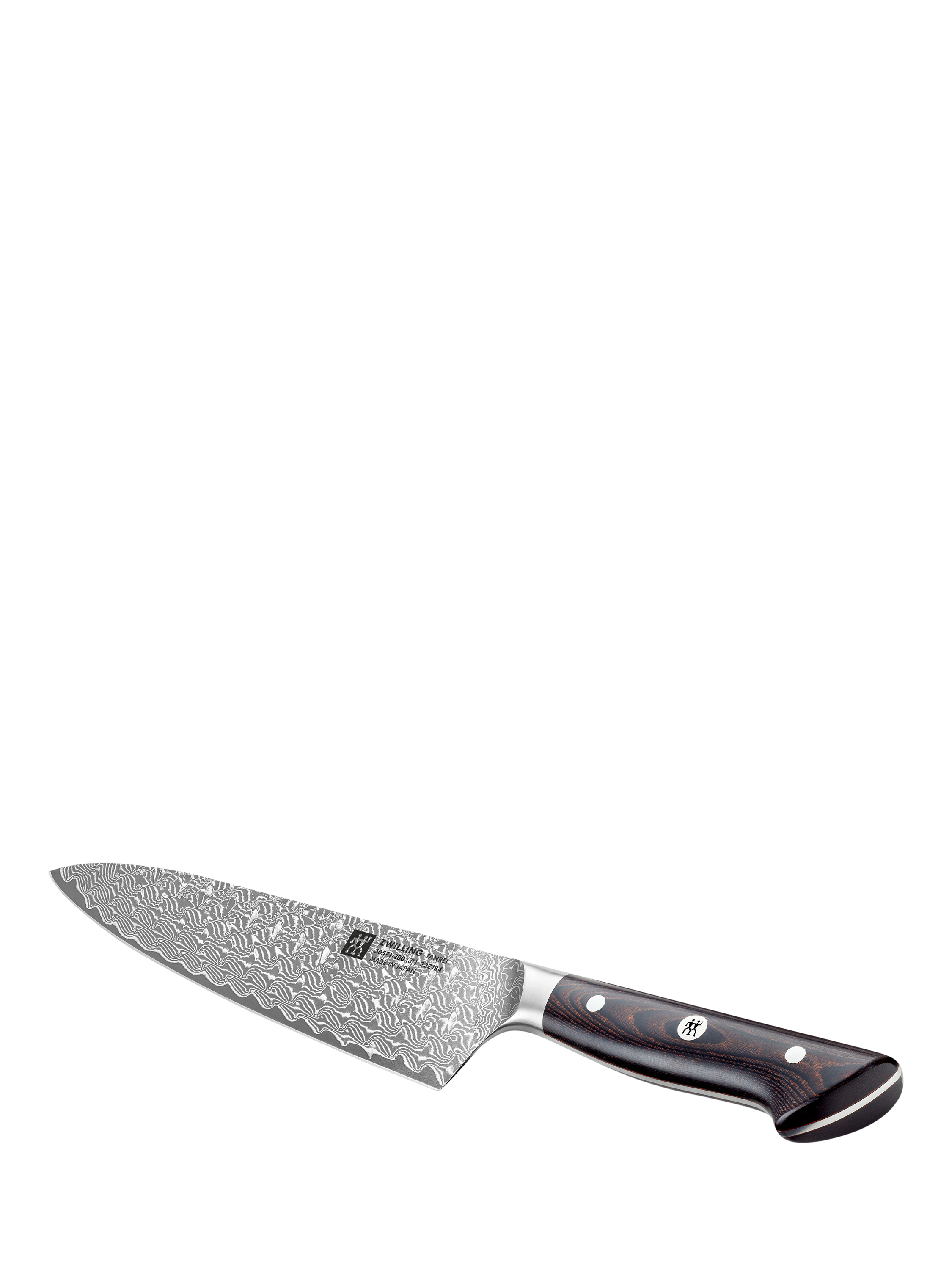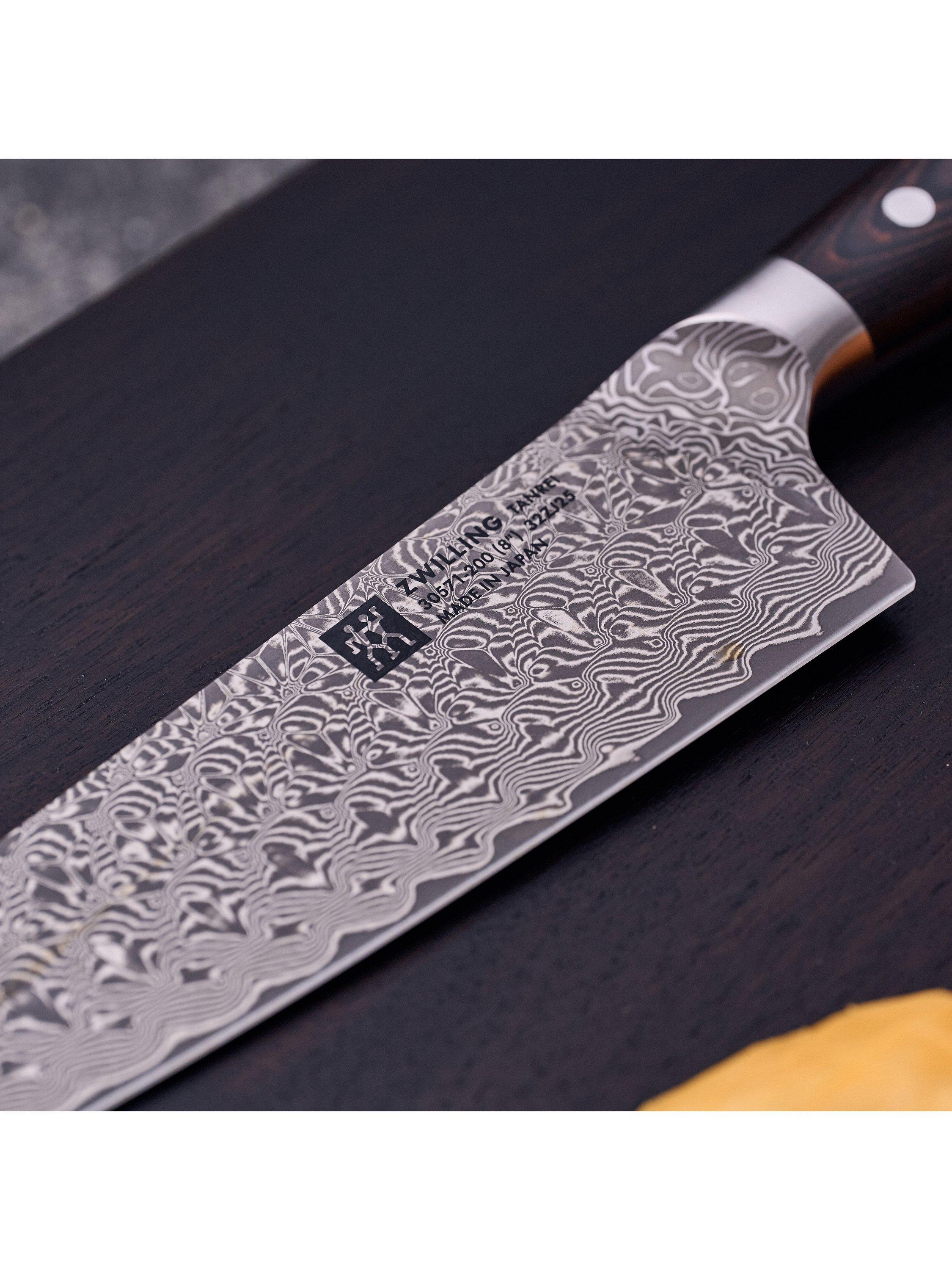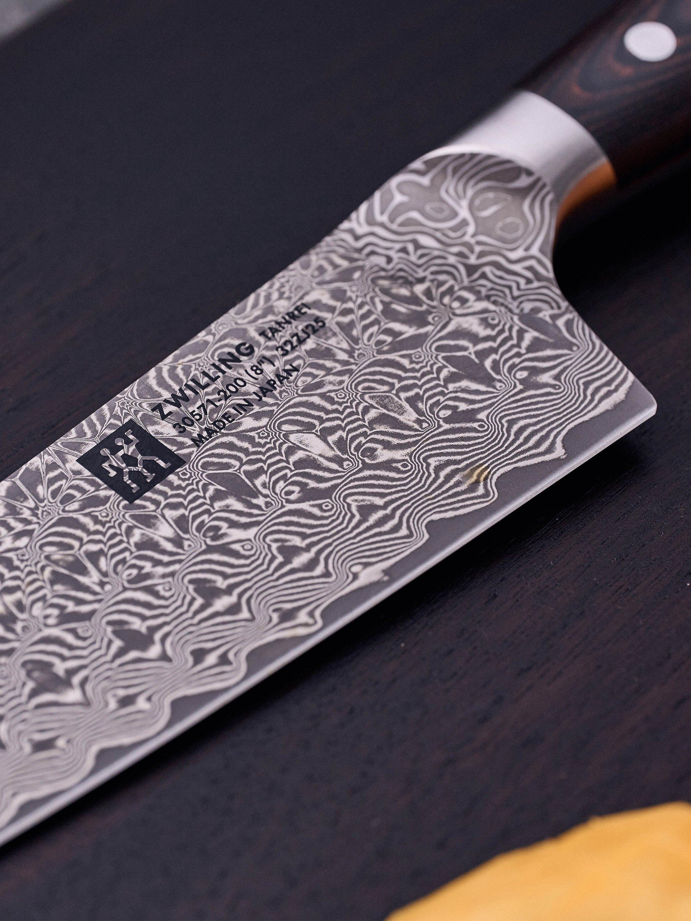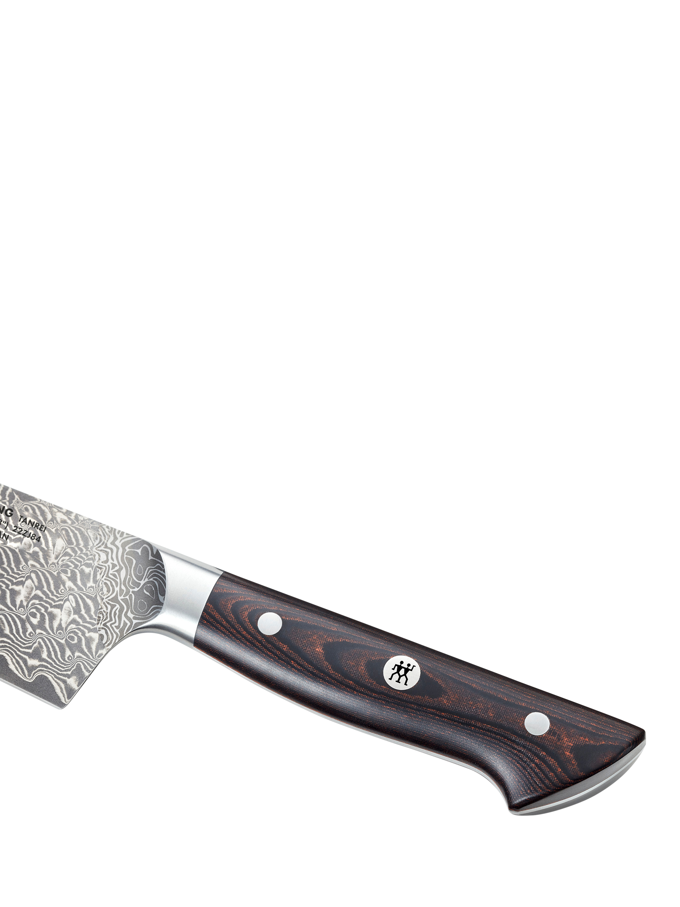 Each knife has a unique Damascus pattern, making every knife one of a kind. The range features an elegant triple-rivet handle made from high-quality Micarta, and a slim bolster, ideal for Asian cutting techniques.