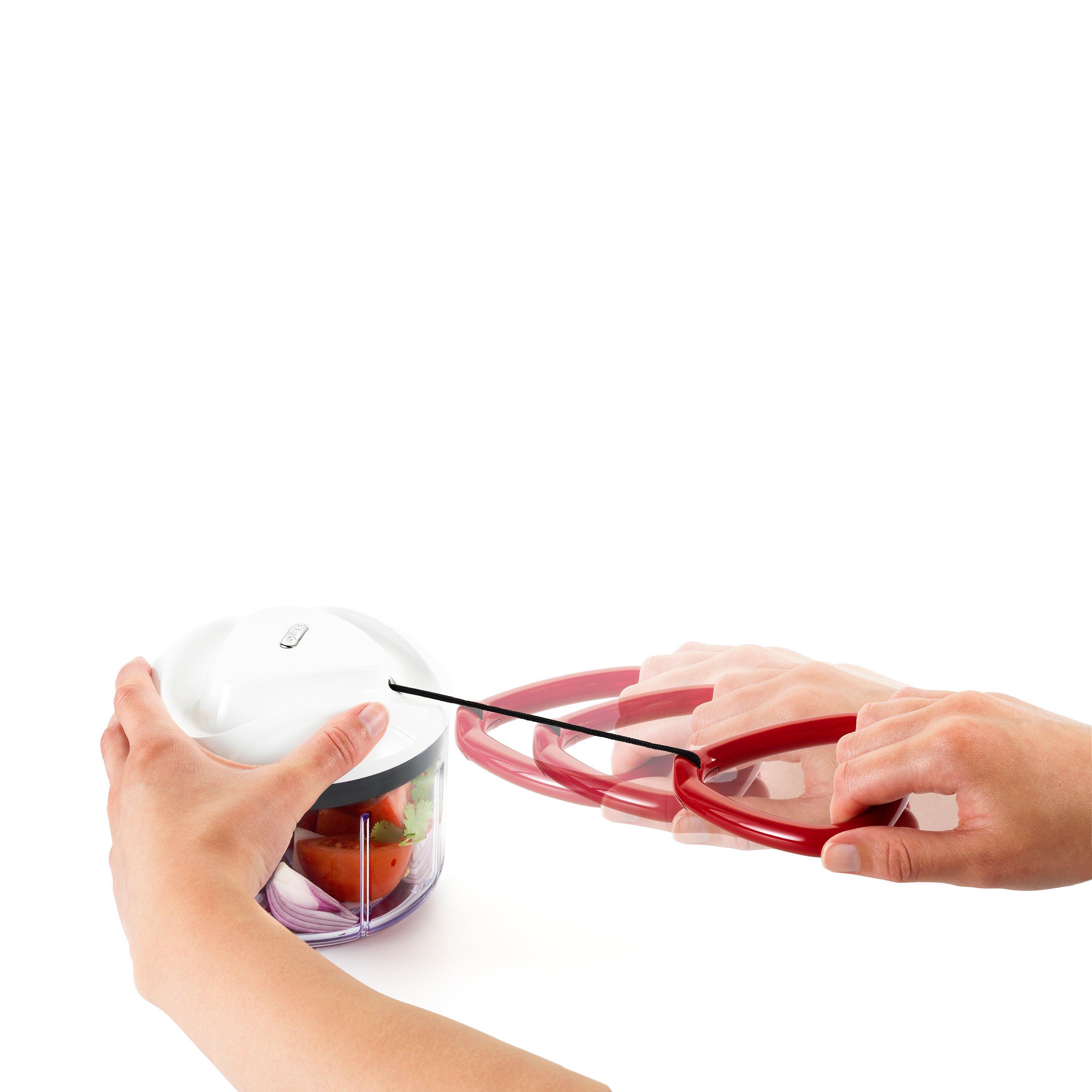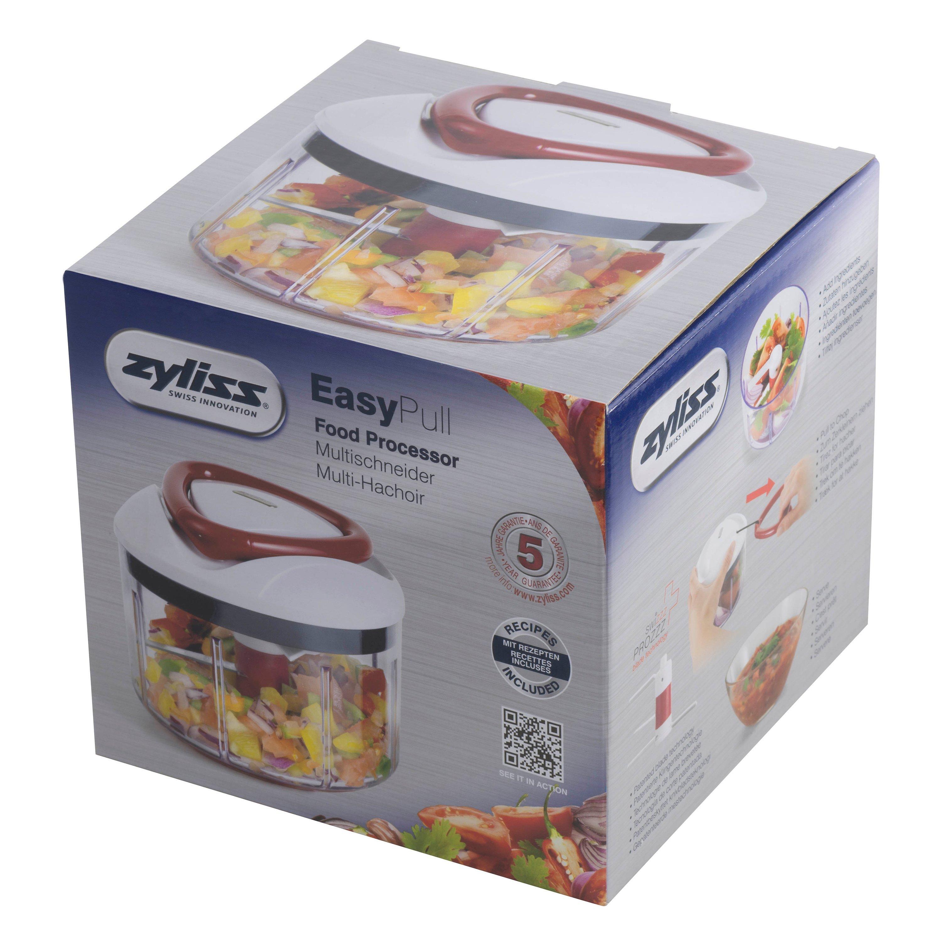 The Zyliss EasyPull Food Processor is a manual food processor that mixes, chops, blends and purées food by simply pulling the handlet. It has a patented design allowing you to chop food with ease and consistency. This kitchen tool is a must have and will change your cooking experience, making chopping, mixing, blending and puréeing easier and more convenient without the need or fuss of electric tools and gadgets.